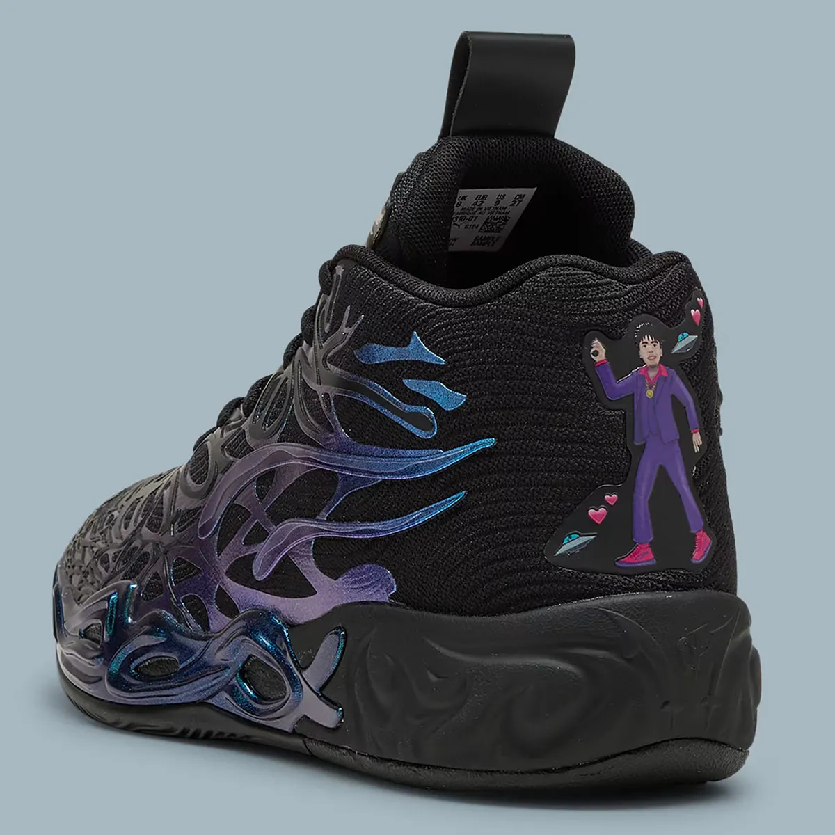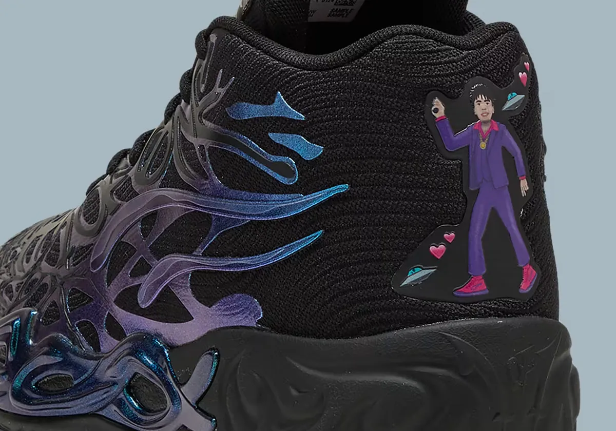 La tige est ici habillée en noir avec des finitions scintillantes entre bleu et violet, mais le inattendu se trouve sur le talon avec le dessin d’un LaMelo Ball en mode danseur, vêtu d’un costume violet tout droit sorti des années 70 et une chemine rose, visiblement prêt à enflammer le dancefloor. Il ne manque plus que la boule à facettes !