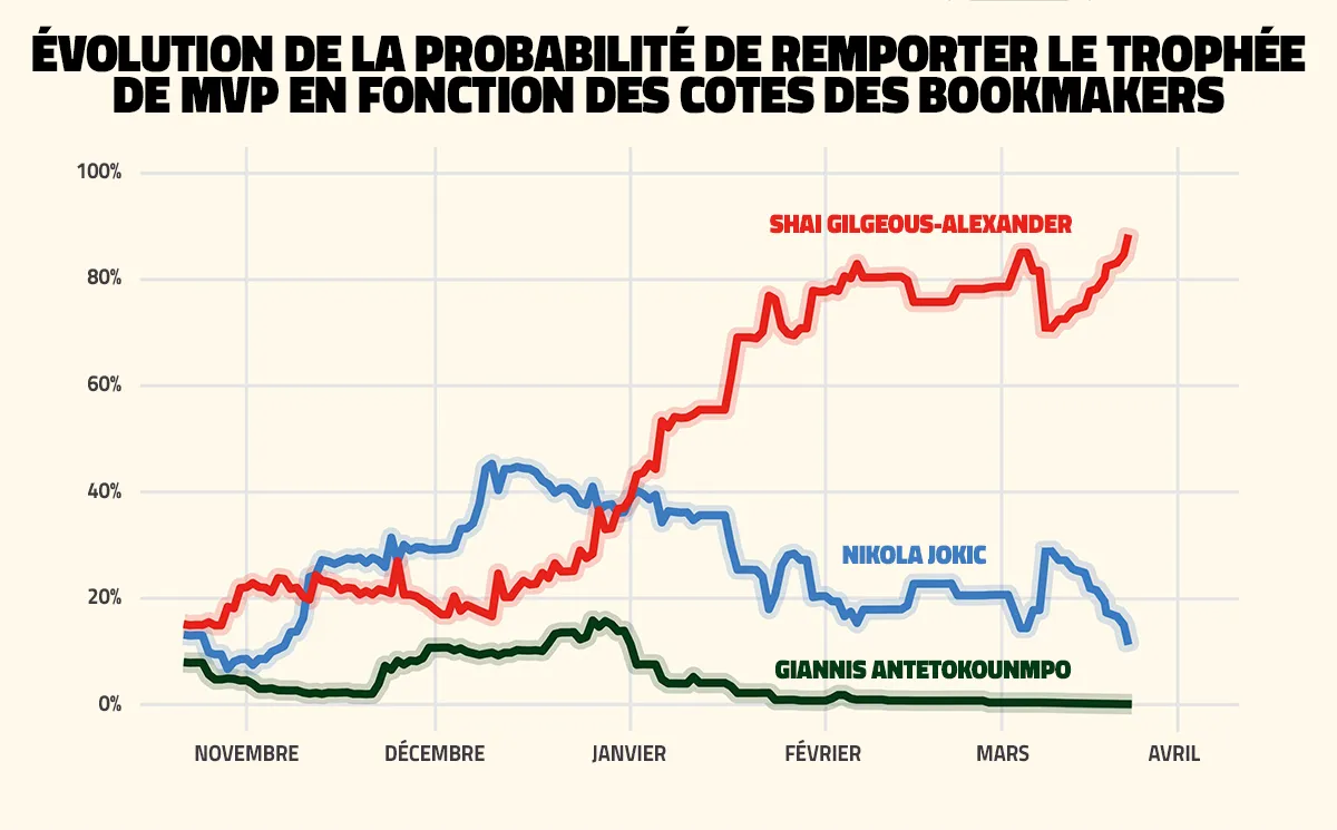 Owen Phillips, qui suit l'évolution des cotes des joueurs pour le trophée de MVP depuis le début de la saison, avait noté que le match à 30-20-20 du “Joker” avait relancé la course… sauf que, depuis, Shai Gilgeous-Alexander a remis un coup de collier, et les dernières absences du pivot de Denver ont sans doute validé l'issue.
