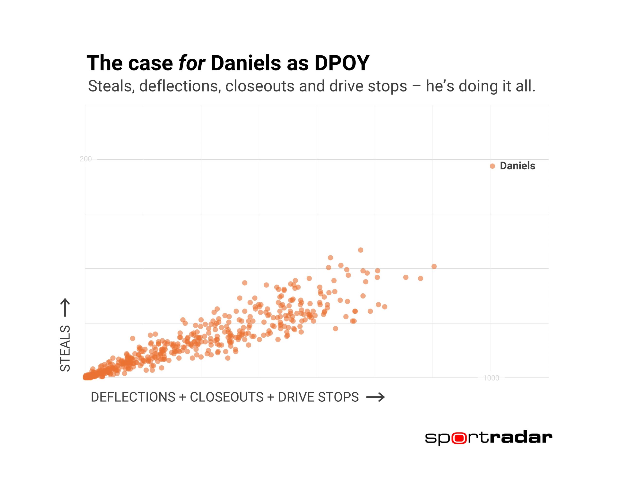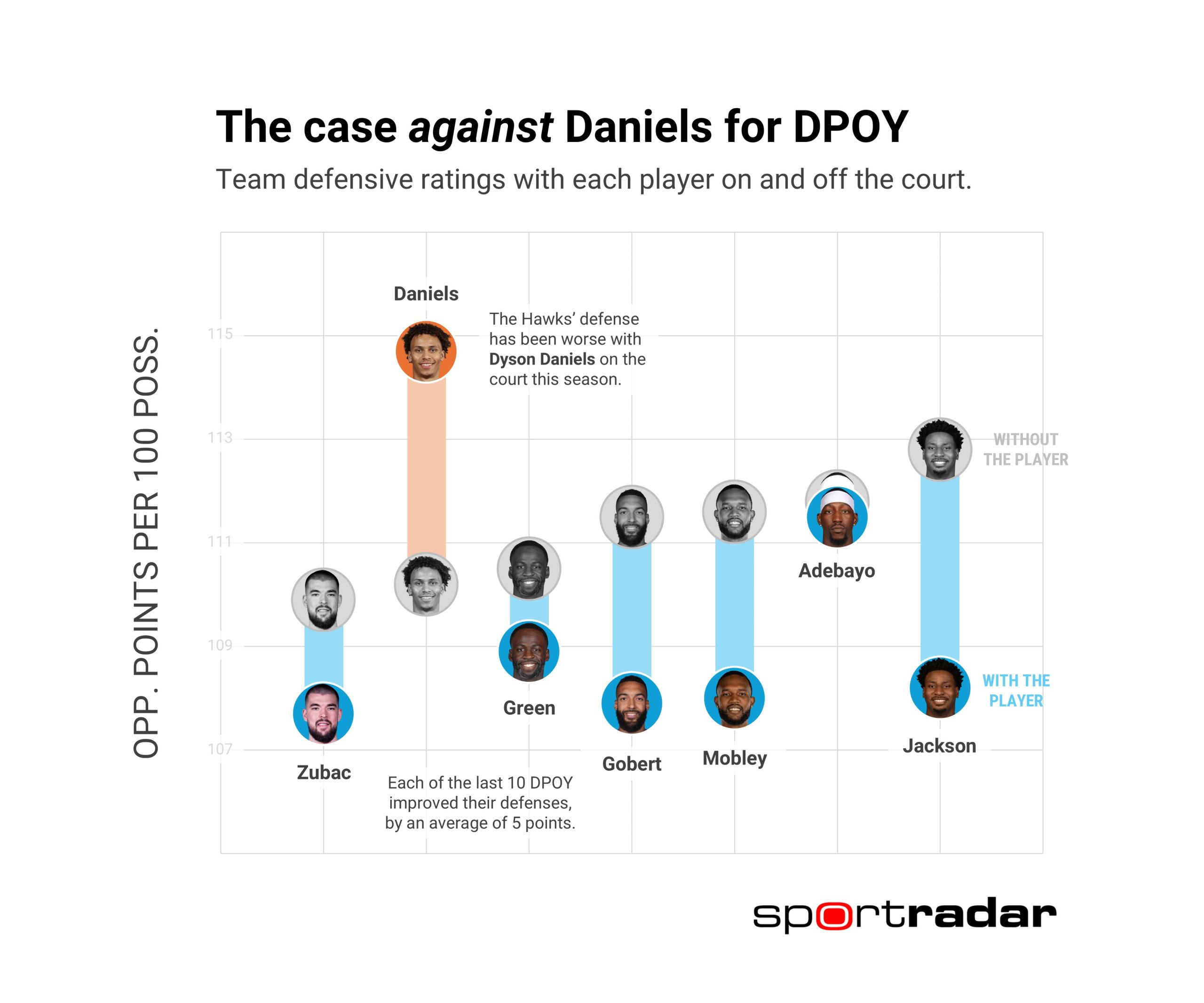 Suffisant pour décrocher le trophée de défenseur de l’année (DPOY) devant Evan Mobley et Draymond Green ? Comme le montre Todd Whitehead, spécialiste des statistiques, si le voleur des Hawks a un impact absolument énorme avec son activité, il traîne un boulet au pied : contrairement aux autres gros défenseurs, son équipe défend mieux quand il n’est pas sur le parquet…
