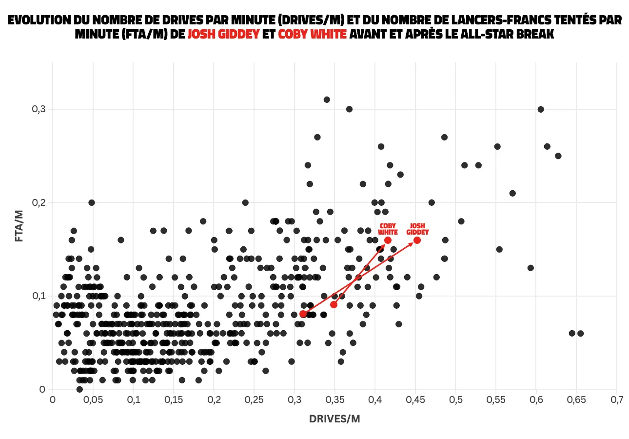 Ce petit artifice ne doit pas occulter les fondamentaux stratégiques derrière ces Bulls nouvelle mouture. Cette hausse du nombre de lancers-francs trouve avant tout sa source dans l’insistance du duo Giddey – White à attaquer le cercle adverse. Les deux joueurs figurent parmi le Top 20 de la ligue depuis début février au nombre de pénétrations par match – Coby White 15e, Josh Giddey 17e -, devenu un part encore plus prépondérante de leur jeu.