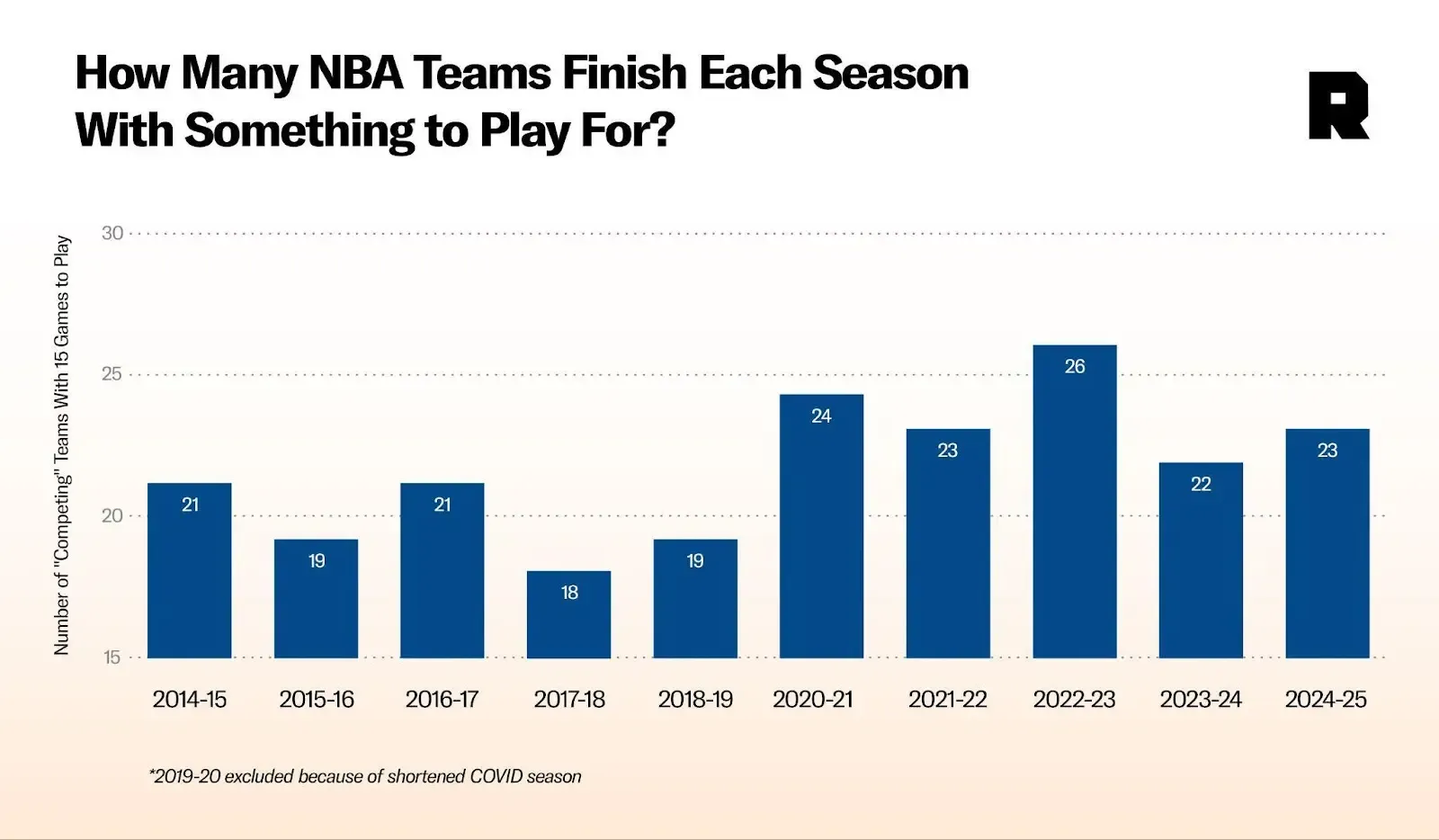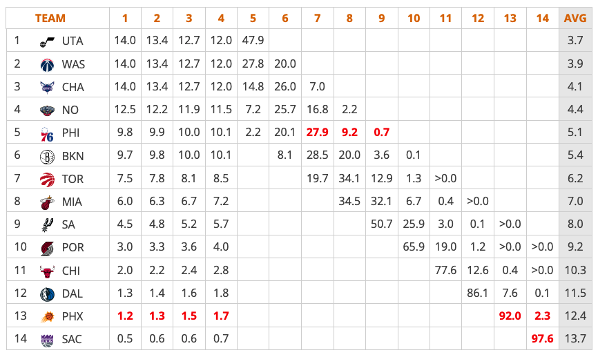Cette année, sept équipes peuvent actuellement être considérées comme hors course pour les playoffs : les Raptors, les Sixers, les Nets, les Pelicans, les Hornets, les Wizards et le Jazz.
