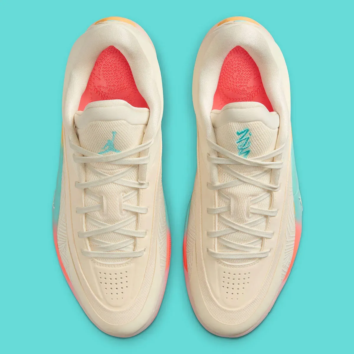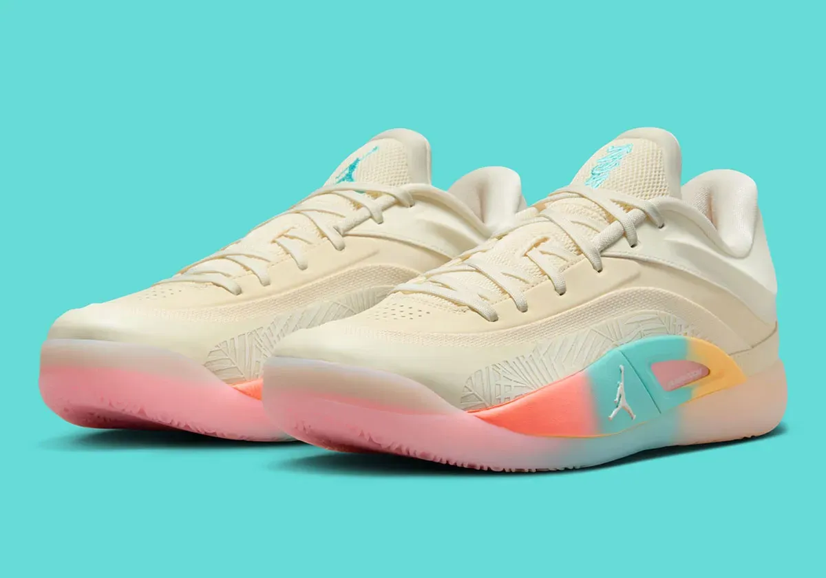 La tige d'un blanc nacré fait ainsi penser à une inspiration « lait de coco » avec un petit motif « palmiers » ressortant en blanc sur l'empeigne. Le petit clin d’œil aux tropiques est également présent au niveau intermédiaire de la semelle avec cette palette entre rose bleu ciel et jaune faisant penser aux couleurs de l'été. On retrouve ce bleu ciel sur la languette et le talon pour faire ressortir l'inscription « Zion » et une pastille jaune sur laquelle apparaît le logo « Jumpman ».