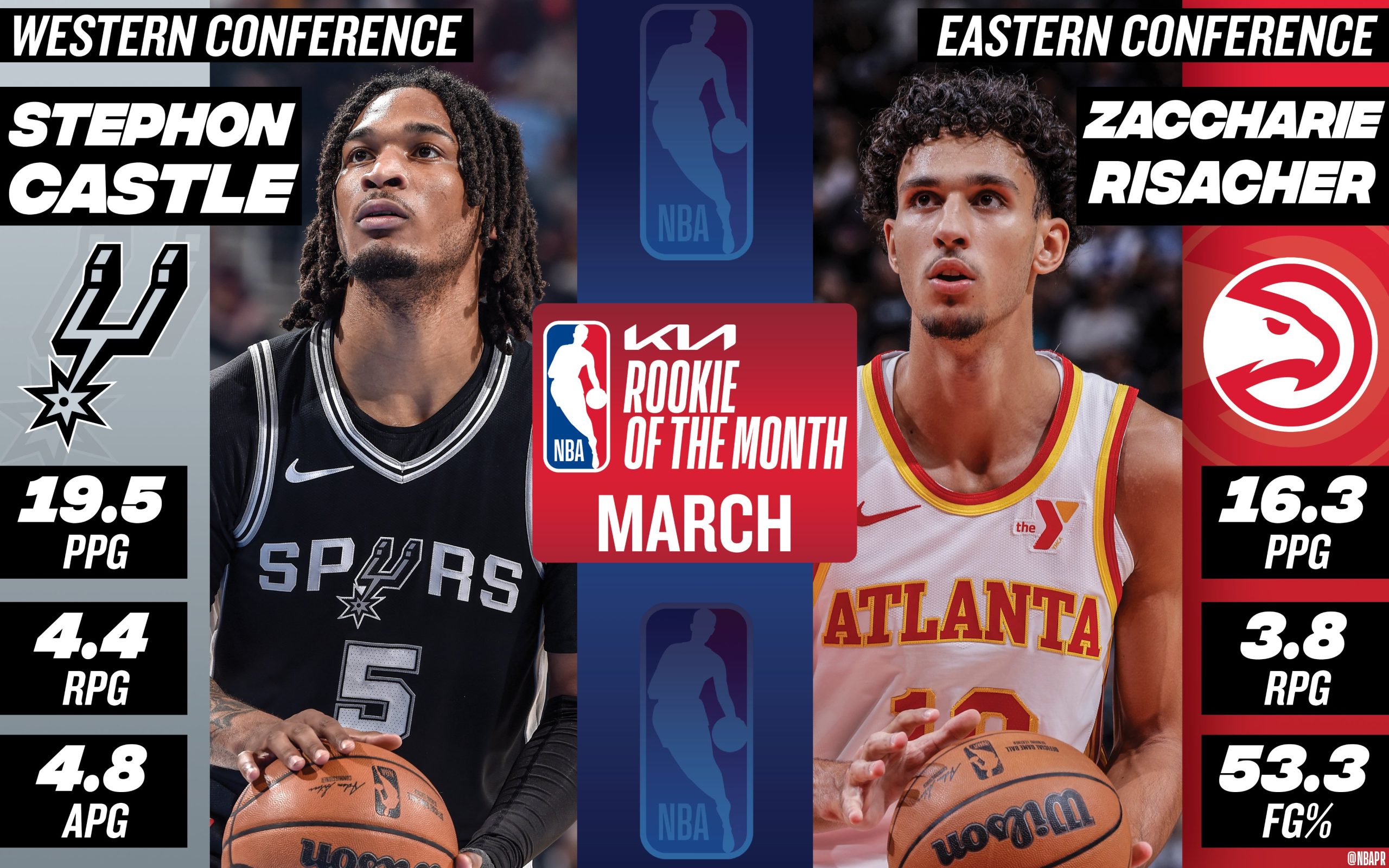 Déjà élu “Rookie of The Month” pour la conférence Est en février, Zaccharie Risacher fait le doublé en gagnant aussi le trophée en mars ! À l’Ouest, c’est Stephon Castle, déjà choisi en janvier, qui a été choisi.