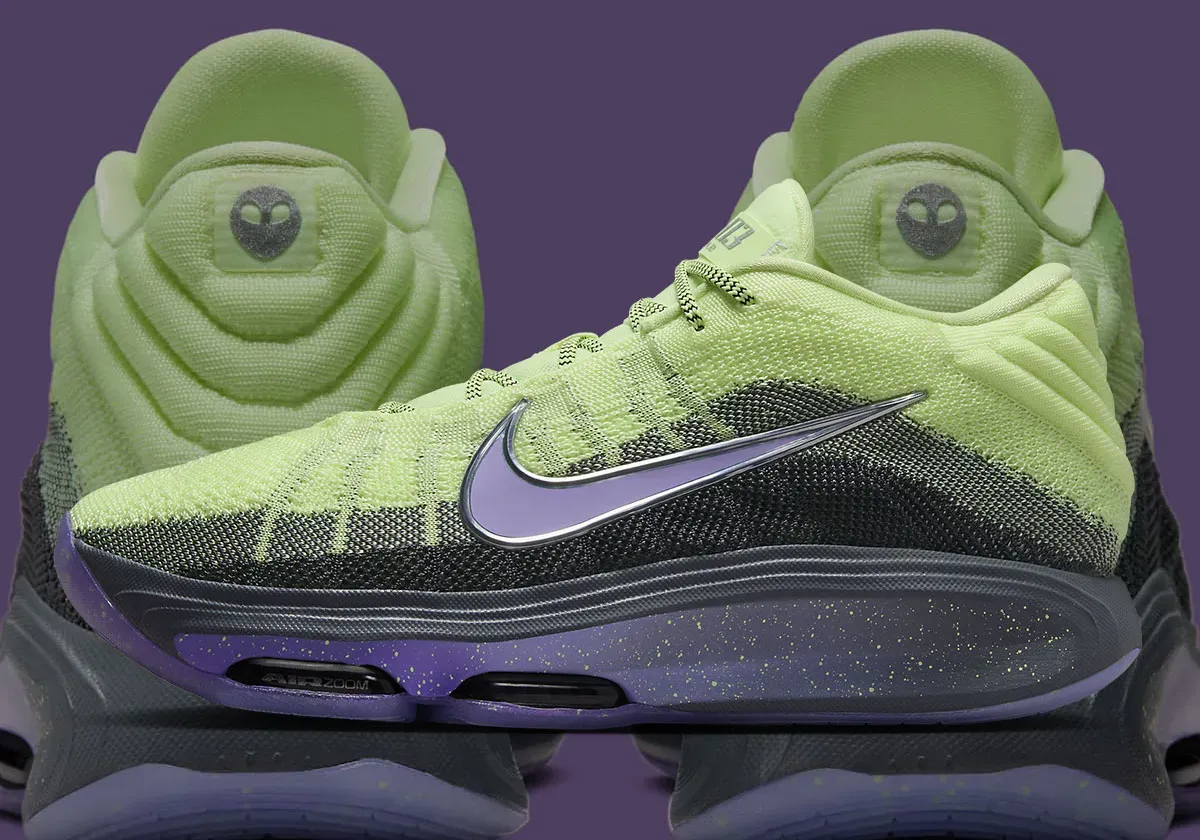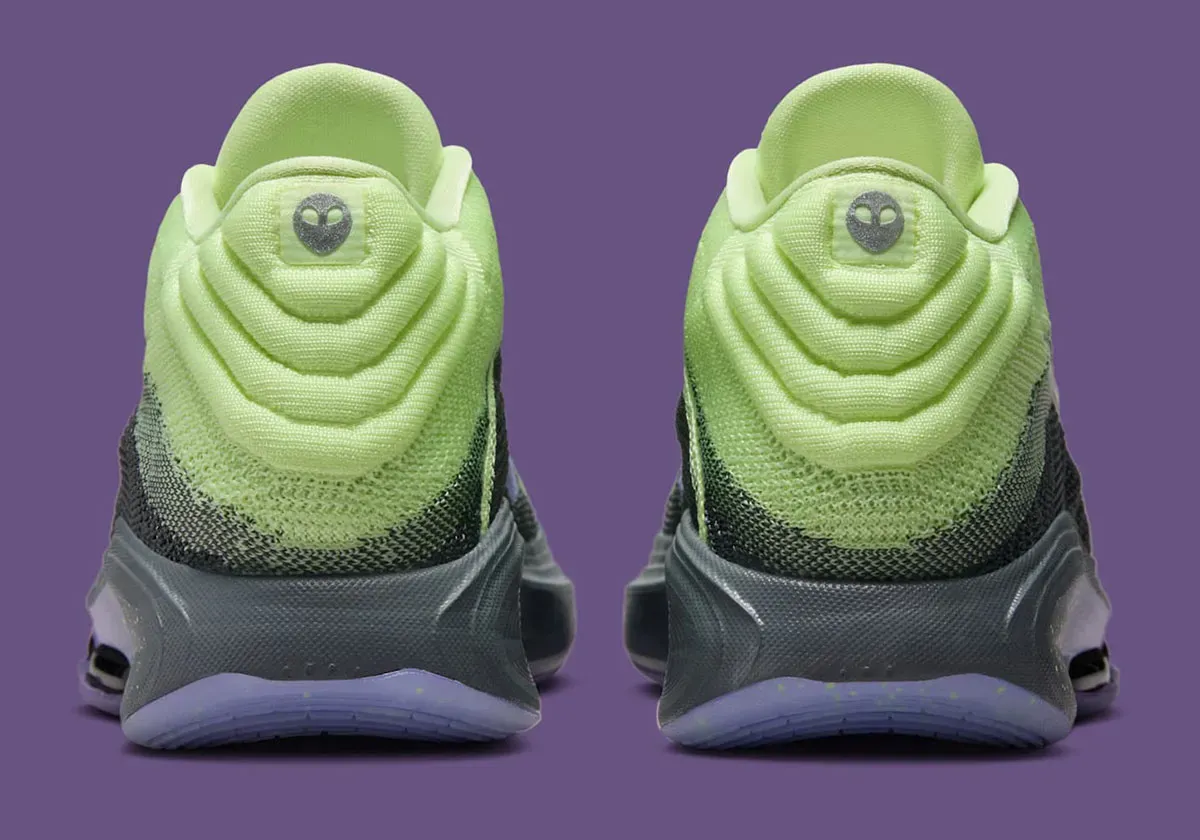 La partie supérieure de la tige ressort en vert fluo et est accompagné d'une base noire, l'ensemble étant flanqué d'un « Swoosh » violet. On retrouve aussi le fameux logo « Alien » sur le talon, en gris. La semelle intermédiaire en noir tacheté est complété d'un revêtement extérieur translucide allant du violet au bleu-gris.