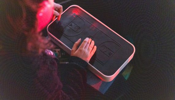 Le dispositif possède une surface en caoutchouc avec des reliefs représentant un terrain de basketball. Connecté en Wi-Fi aux stats en temps réel de la NBA, il permet à l’utilisateur de suivre le ballon en temps réel avec les mains. Des vibrations plus ou moins fortes indiquent l’emplacement, les points marqués (1, 2 ou 3) et un écouteur donne des informations audio supplémentaires comme les rebonds ou les tirs ratés. Des boutons permettent aussi de régler le volume et de recevoir des mises à jour sur le score.