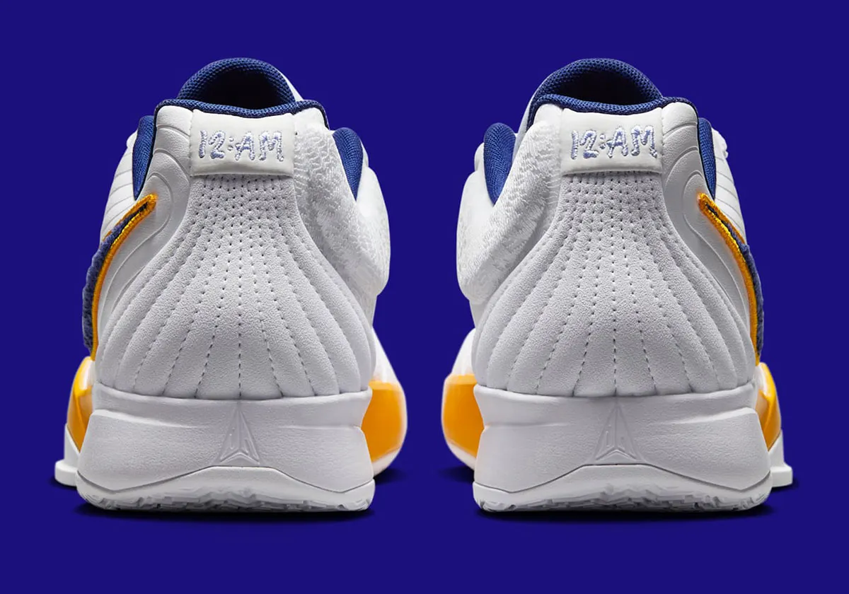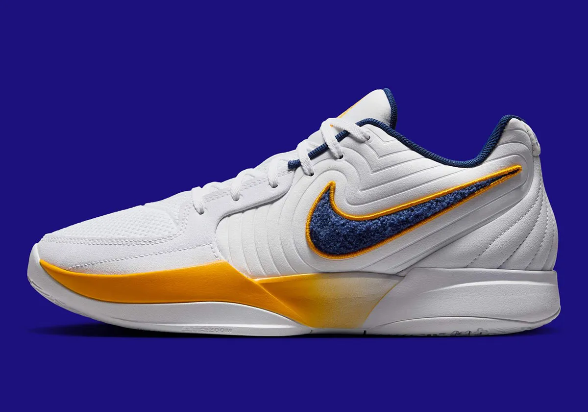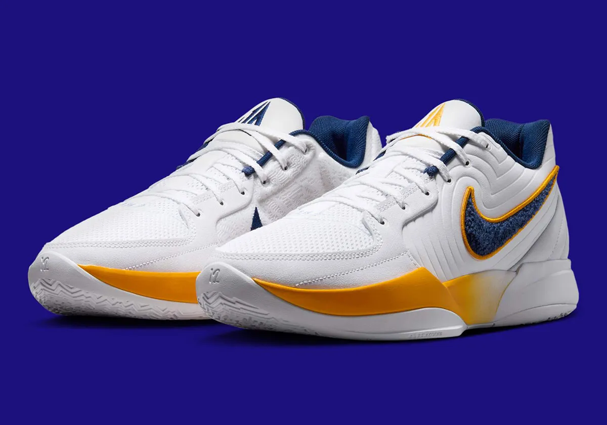 La tige blanche est ici assortie de touches de d’orange et bleu marine, comme sur le « Swoosh », avec des contours orange et un motif peluché similaire vestes universitaires, en bleu. Le logo du joueur ressort en bleu sur la languette de la chaussure droite et en orange sur la gauche.