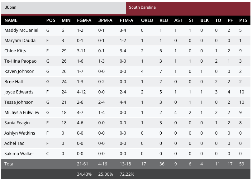 Une victoire nette et sans bavure, qui permet à la fac de Geno Auriemma de remporter son 12e titre, et le premier depuis neuf ans. Une éternité pour le programme, qui régnait en maître sur le début du XXIe siècle, avec 10 victoires entre 2000 et 2016, alors que le South Carolina avait remporté trois des sept derniers titres…