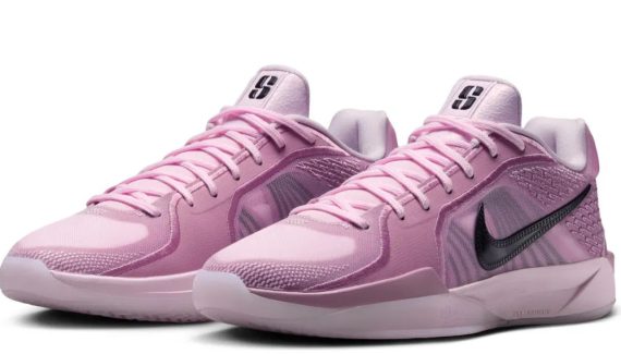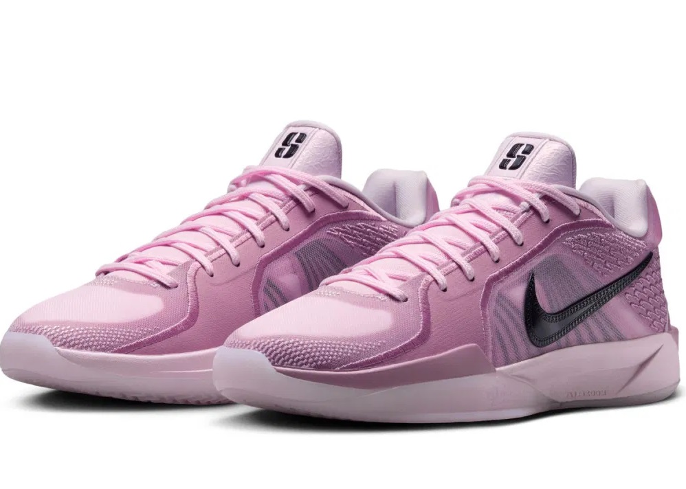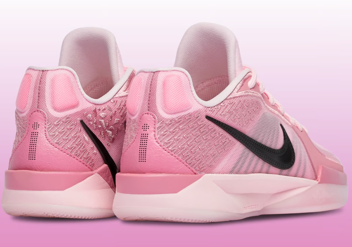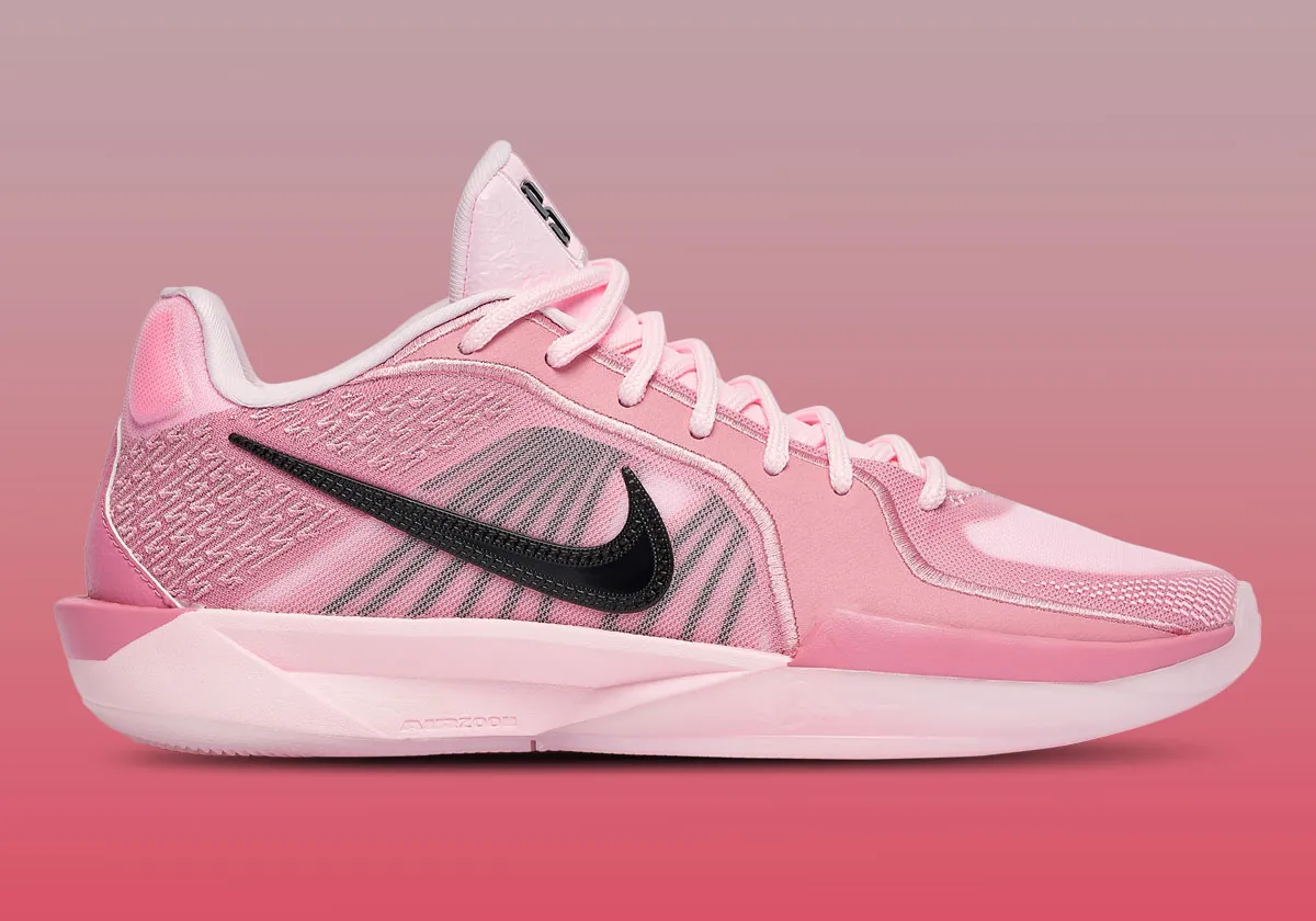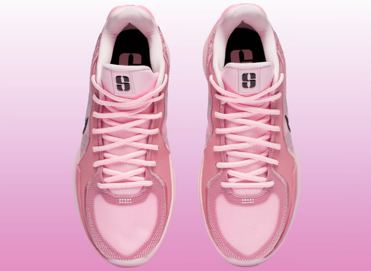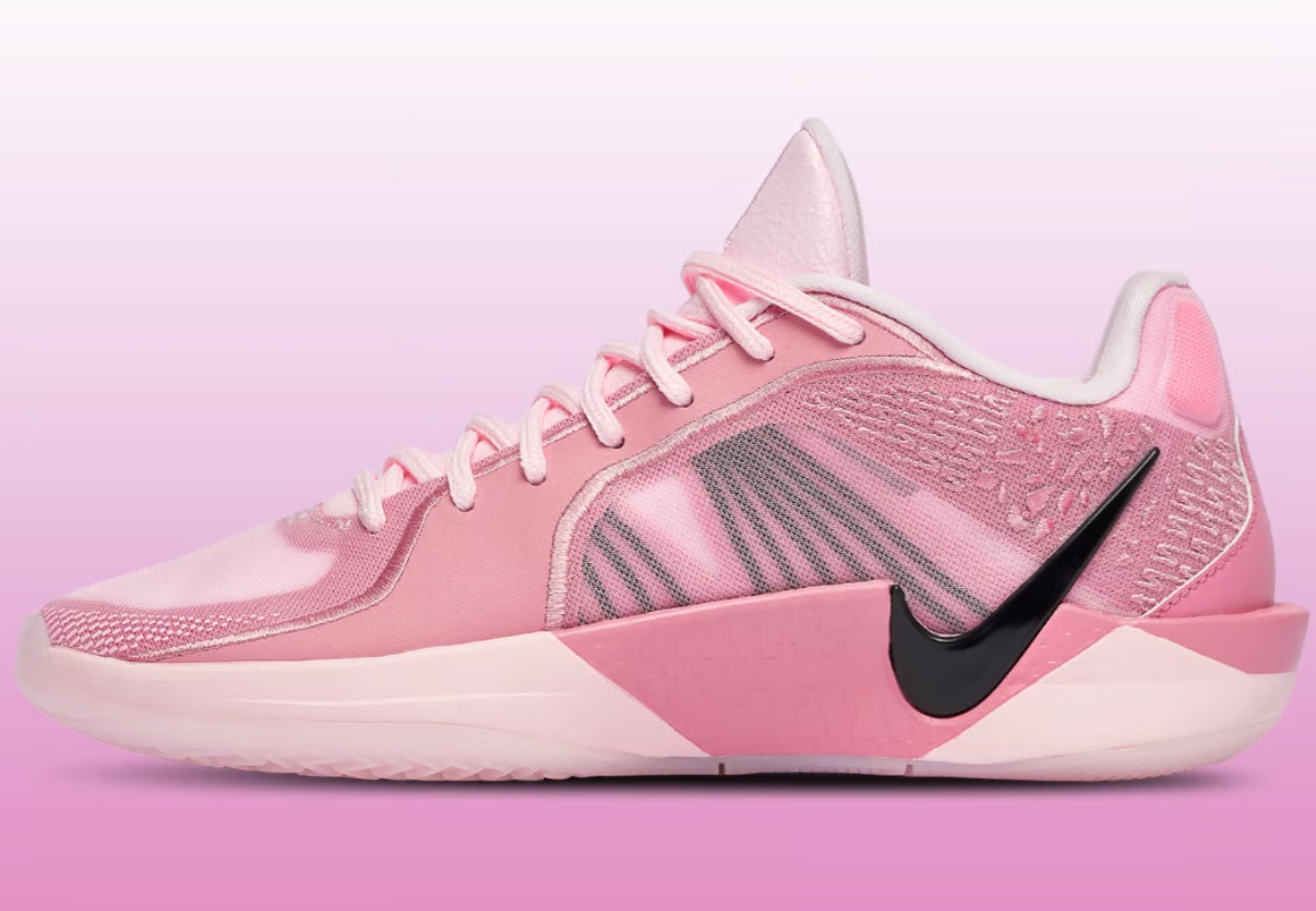 On peut effectivement y voir un petit côté « Sakura », avec sa tige rose assortie de finitions en noir, pour faire ressortir le « Swoosh » sur l’empeigne, les câbles « Flywire » ou le logo de Sabrina Ionescu sur la languette.