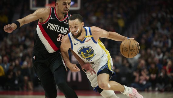 Alors que Stephen Curry (14 points, 5 rebonds, 5 passes) rejoint momentanément les vestiaires et en ressort avec un gros bandage sur son pouce droit, les Warriors enchainent. Leur défense met les Blazers sous l’éteignoir, avec seulement 17 points en deuxième période, et trois nouveaux tirs primés de la paire Curry – Hield mettent les Dubs à +13 à la pause (50-37).