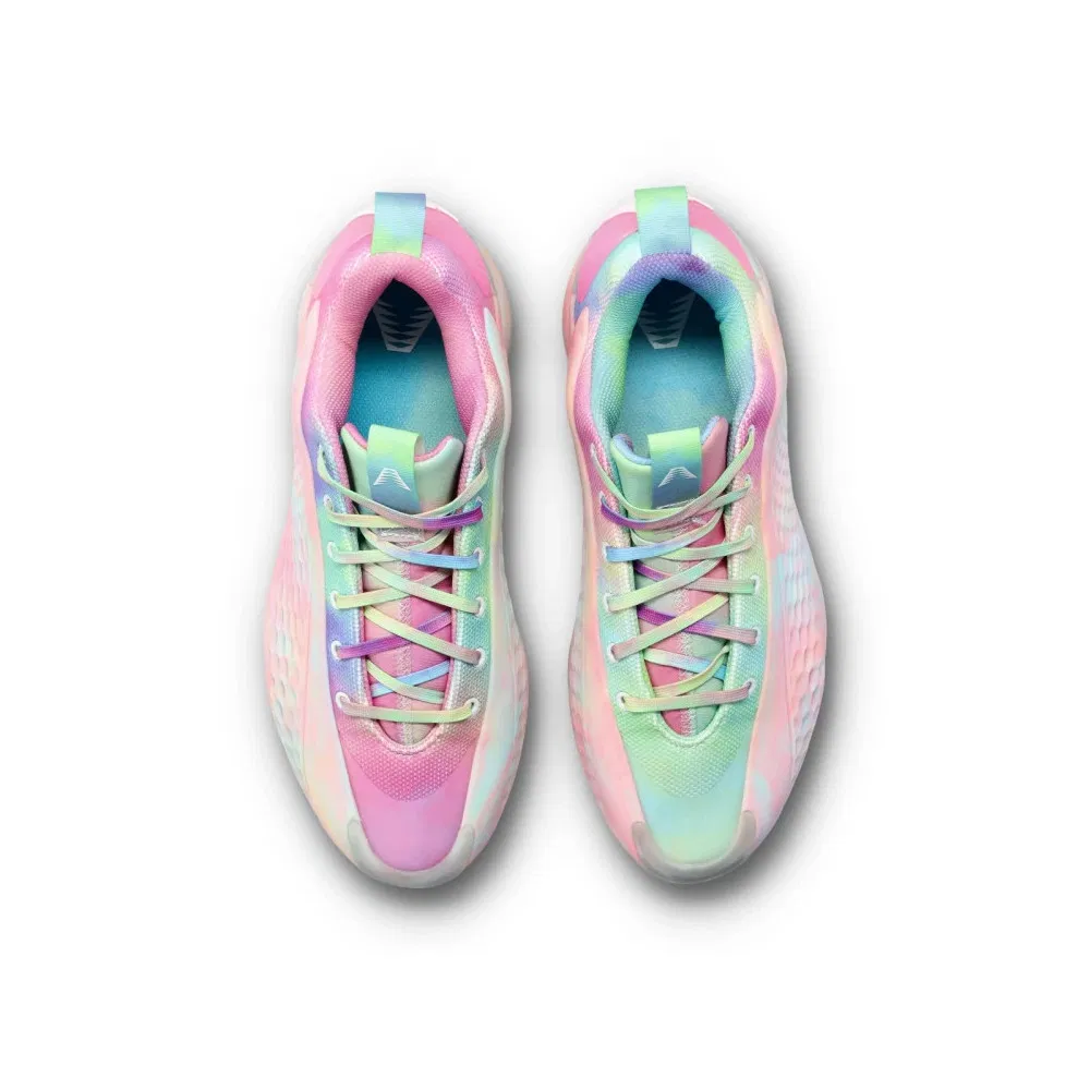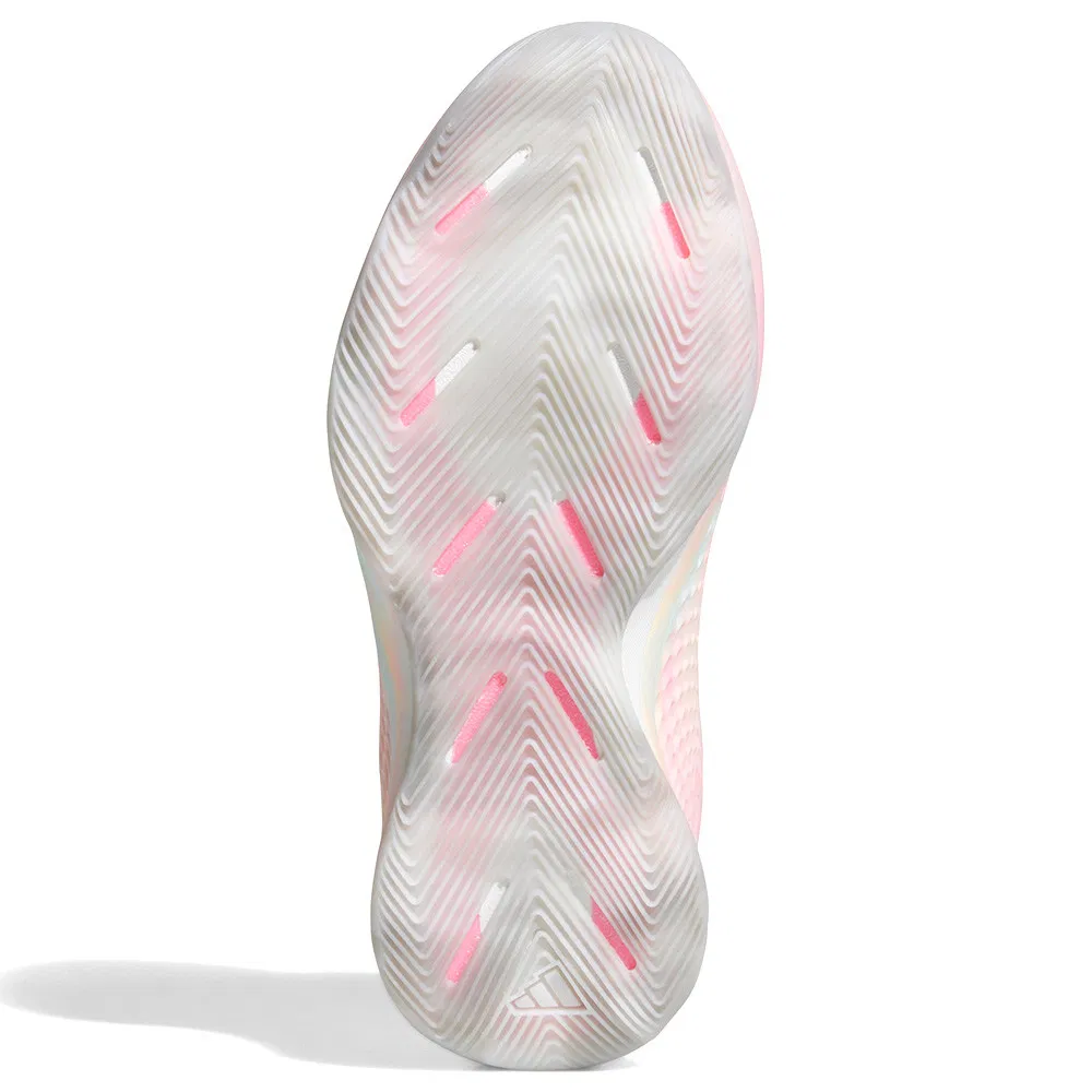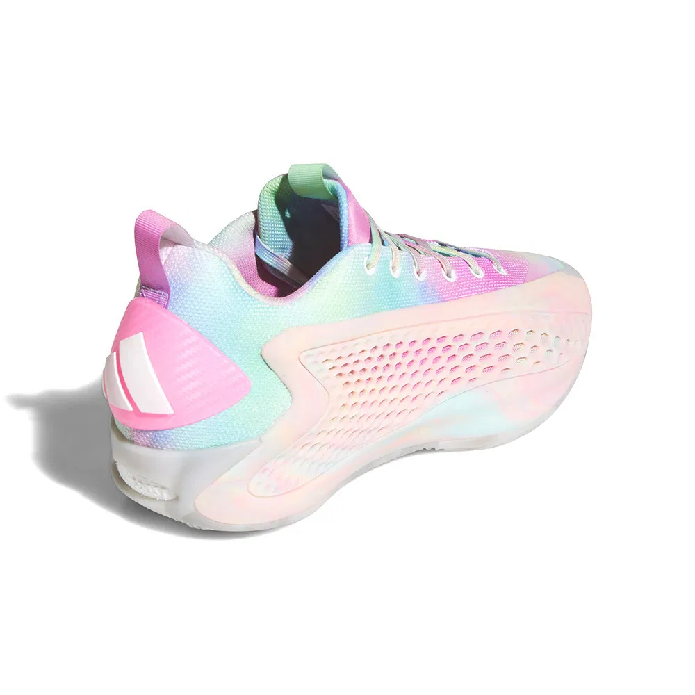 Cette fois, ce coloris « Tie Dye » tranche dans le vif avec une tige dans le style « Tie Dye » multicolore aux tons pastel allant du violet-rose au vert pâle. Le logo adidas sur le talon et du joueur sur la languette apparaissent en blanc, respectivement sur fond rose et bleu.