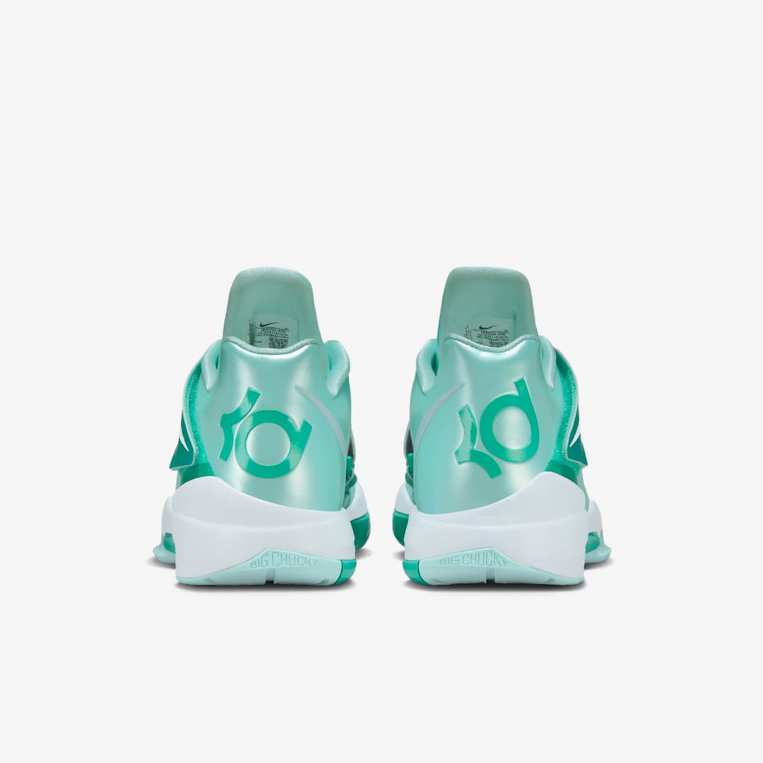 La tige est en effet composée d’un coloris vert menthe, avec une touche un peu plus foncée sur le scratch recouvrant la languette et qui permet aussi de faire ressortir le numéro 35 sur la languette et le logo « KD » sur le talon. Le « Swoosh » présent sur le scracth apparaît pour sa part en blanc, tout comme la semelle intermédiaire.