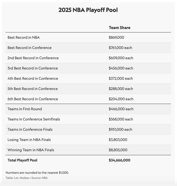 L’an passé, la cagnotte globale pour les joueurs des franchises qui disputaient la postseason avait augmenté de 25%, grâce à l’entrée en vigueur du nouvel accord collectif en NBA. Cette saison, la hausse est plus mesurée, à hauteur de 3%, mais il y a quand même 34 660 000 dollars à se partager, précise Sportico…