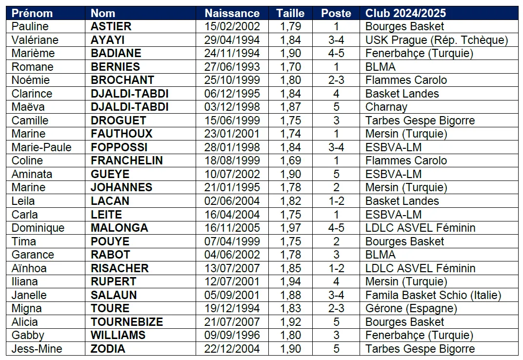 « Bien que le temps de préparation pour l’Euro 2025 soit plus court, nous avons décidé d’annoncer un groupe élargi de 25 joueuses pour le premier rassemblement à Reims. En effet, tout en nous prémunissant d’éventuelles blessures sur la fin des championnats, nous savons que nous devrons faire preuve d’adaptation avec les contraintes liées à la WNBA” confirme Jean-Aimé Toupane. “Plusieurs joueuses engagées dans cette ligue auront la possibilité de nous rejoindre au fur et à mesure des stages ; le fait de se préparer avec un groupe élargi, jeune et talentueux, nous permettra d’avoir un haut niveau d’intensité et d’engagement pendant le mois de préparation et d’aborder la compétition je l’espère dans les meilleures conditions possibles pour atteindre nos objectifs ».
