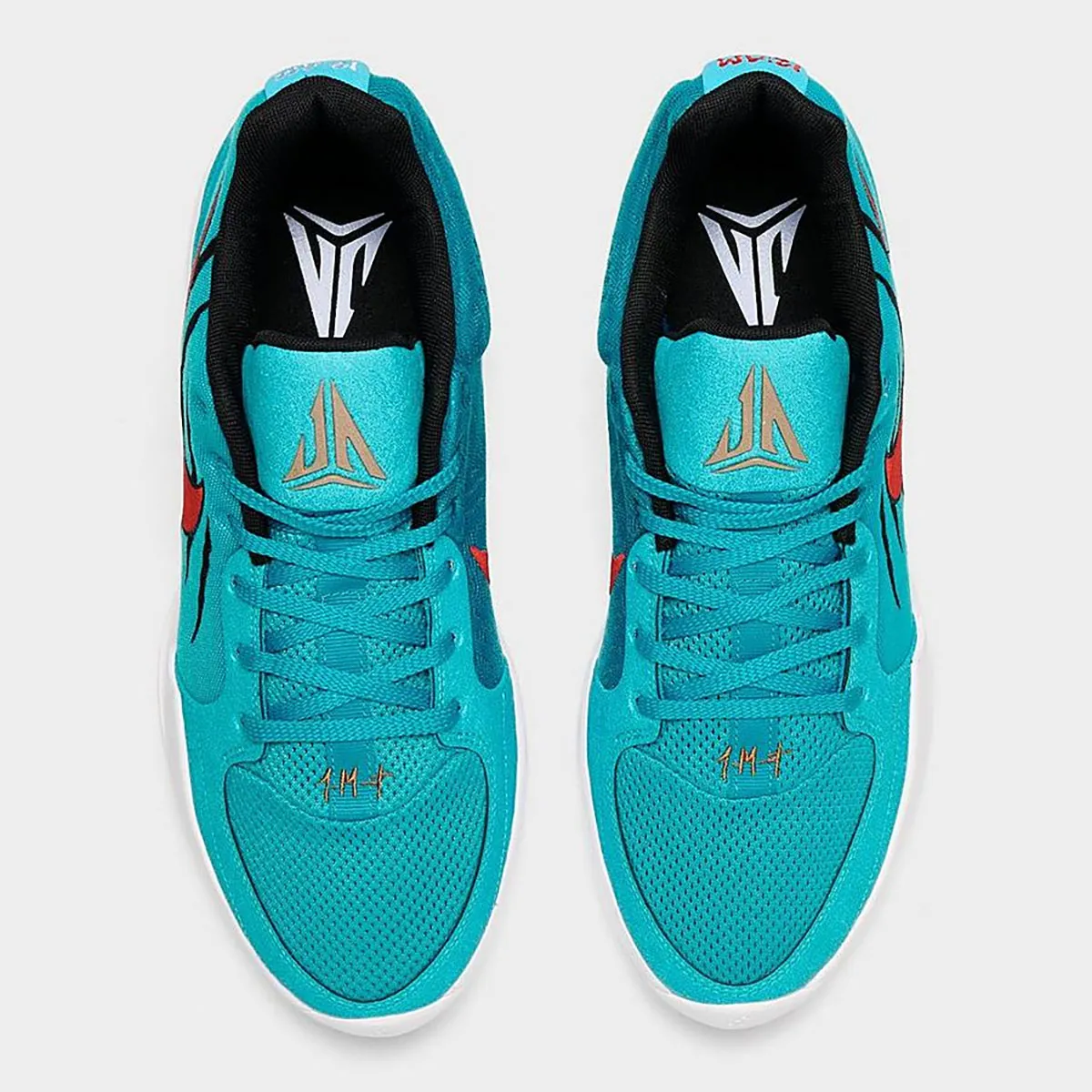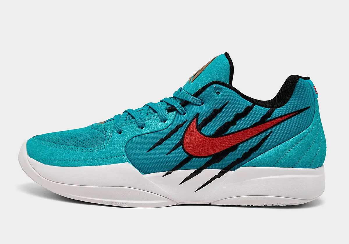 C’est donc tout naturellement que Nike va renouveler l’opération sur la Ja 2. Le coloris est pratiquement identique, avec une tige turquoise, ici flanquée d’un « Swoosh » en rouge et des mêmes traces de griffes de Grizzly en noir sur l’empeigne. L’ensemble repose sur une semelle blanche. Parmi les finitions, le logo du joueur apparaît en doré sur la languette.