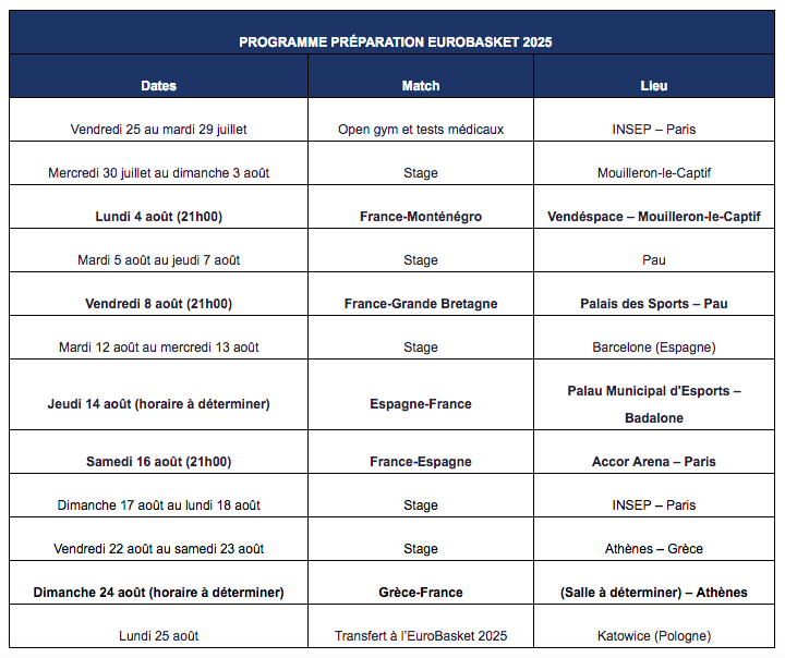 Comme d’habitude, les Bleus débuteront le 24 juillet par un stage à l’INSEP, surtout consacré aux tests médicaux. Direction ensuite la Vendée pour le début des cinq rencontres de préparation, à Mouilleron-le-Captif (Vendéspace, 4 000 places) le lundi 4 août face au Monténégro. Direction ensuite Pau (Palais des Sports, 7 700 places) pour affronter la Grande-Bretagne le vendredi 8 août avant un double duel face à l’Espagne, le mardi 14 août à Badalone puis le jeudi 16 août à Paris (Accor Arena, 15 000 places).