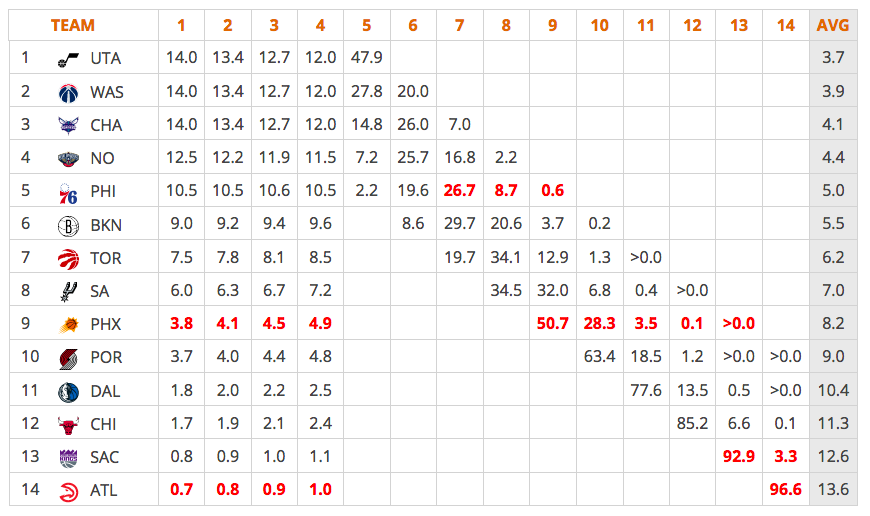 On ne connait pas encore les positions exactes des équipes (et donc les probabilités) avant la “lottery” car c’est lundi que la NBA déterminera les “tiebreakers” entre les équipes qui ont des bilans identiques.