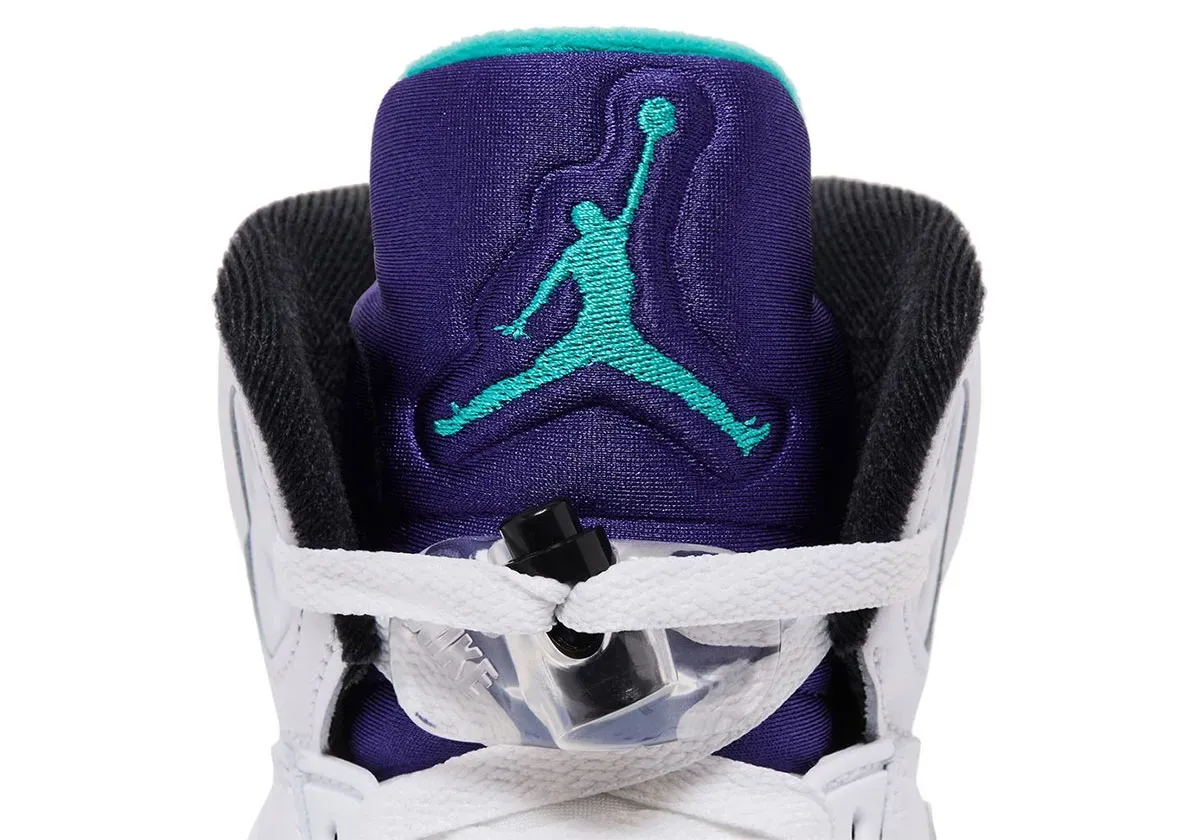 La tige en cuir blanc est ici assortie de touches de violet et bleu turquoise sur la semelle et la languette, en mode “vintage Hornets”. Le logo “Nike Air” figure également sur le talon en bleu turquoise. L'intérieur du col et une partie de la semelle apparaissent en noir, avec aussi une partie en bleu translucide sur le revêtement extérieur.