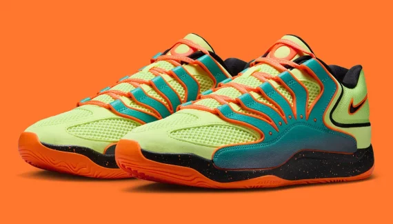 Pour ce premier coloris « New-Stalgia », on retrouve une base de vert clair « Lime » assortie d’orange et de noir. Les renforts latéraux ressortent dans un dégradé autour du vert émeraude pour compléter le tout, avec également une semelle intermédiaire en noir tacheté d’orange. Une pastille « Easy » est également présente sur la partie arrière, ainsi que sur l’intérieur de la languette, en clin d’oeil au surnom de KD « Easy Money ». On note aussi une petite inspiration tirée de la KD 4 « Weatherman » sur ce premier coloris.