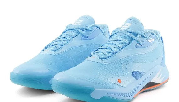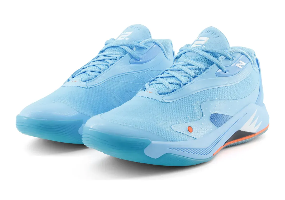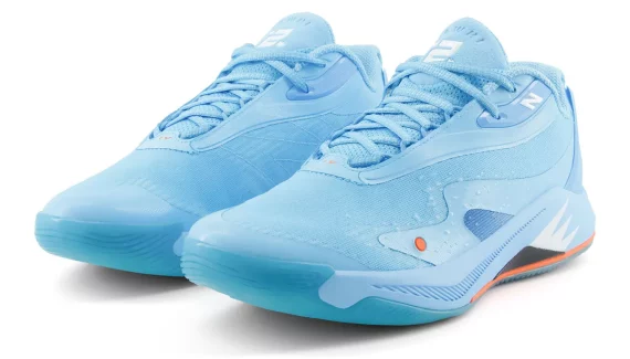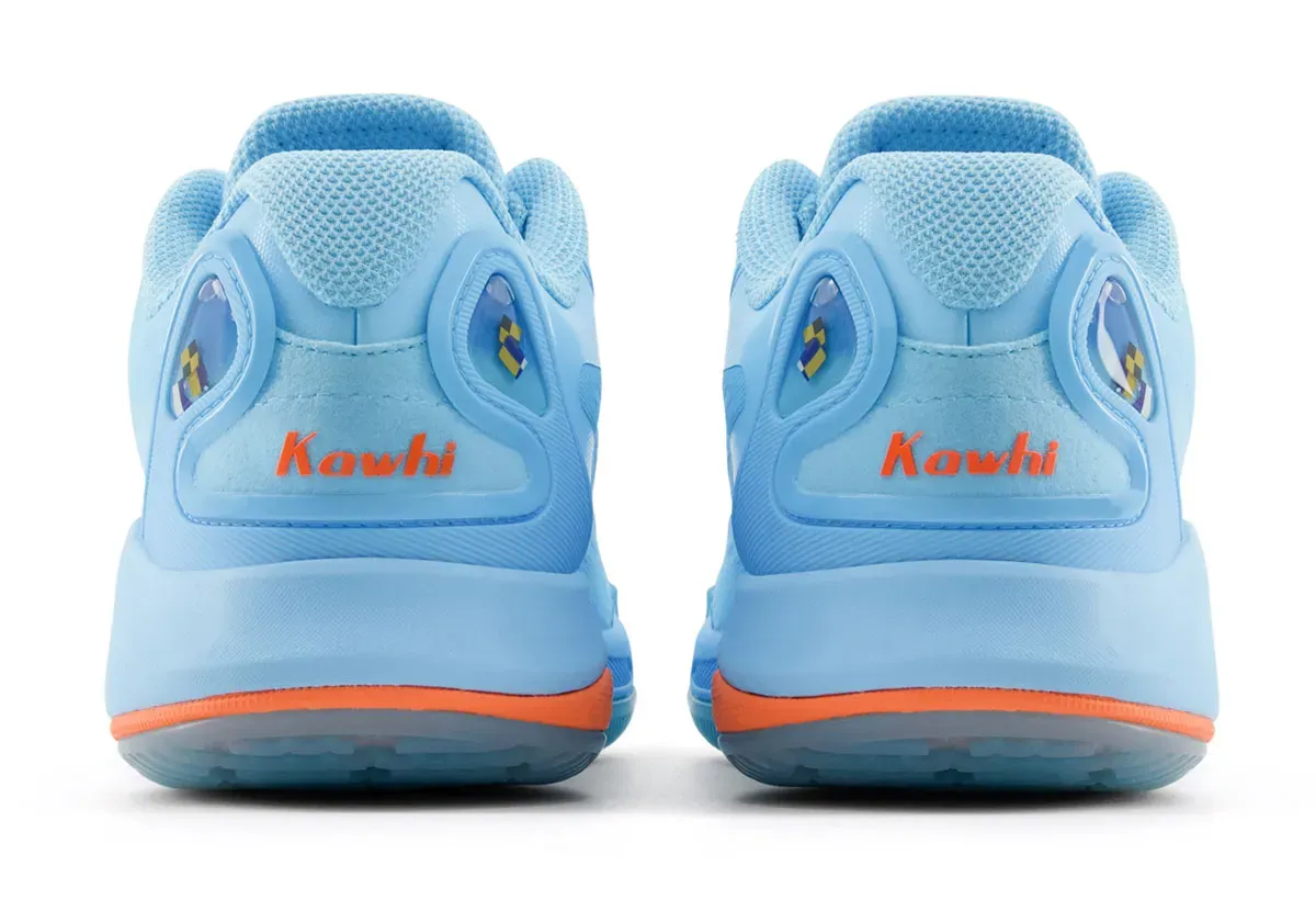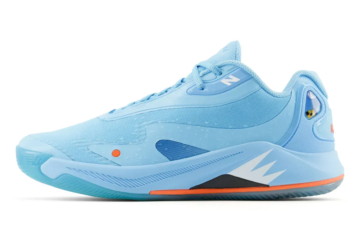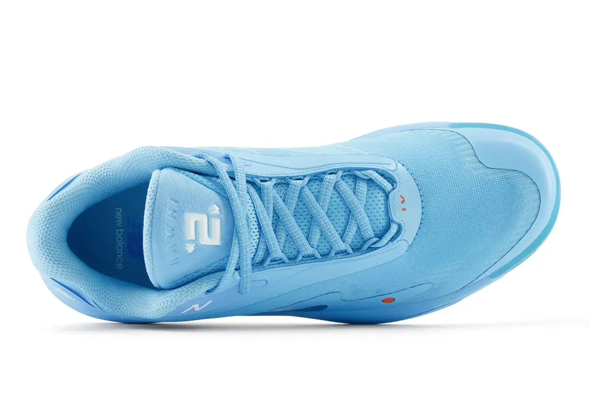 La tige aux tons bleu ciel est complétée de fines touches en orange et blanc. L’inscription « Kawhi » figure en orange sur le talon. Le « N » de New Balance sur le col et le numéro 2 de Kawhi Leonard ressortent en blanc. La semelle intermédiaire en bleu ciel, noir, blanc et orange comporte deux unités d’amorti FuelCell et une plaque en fibre de carbone. Elle est assortie d’un revêtement extérieur en caoutchouc translucide.