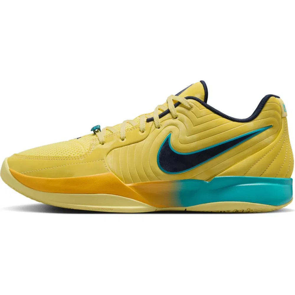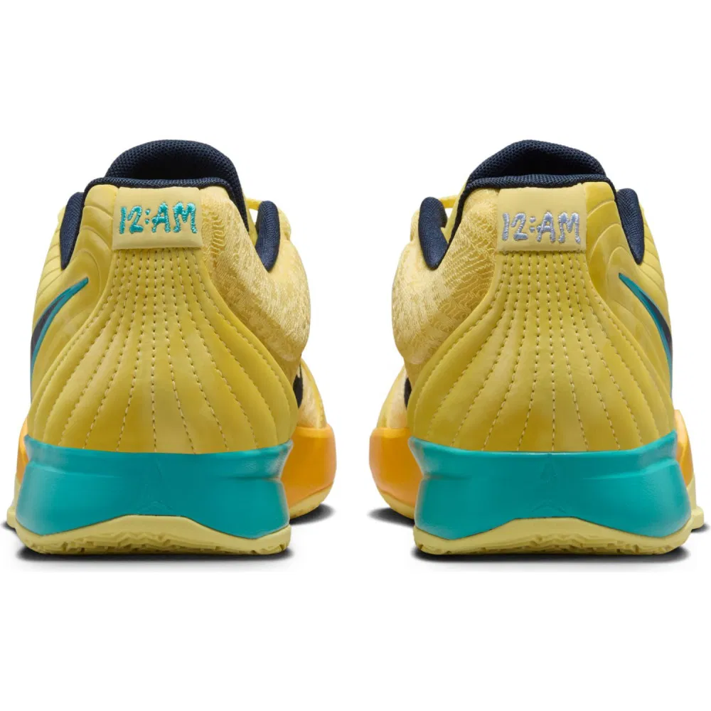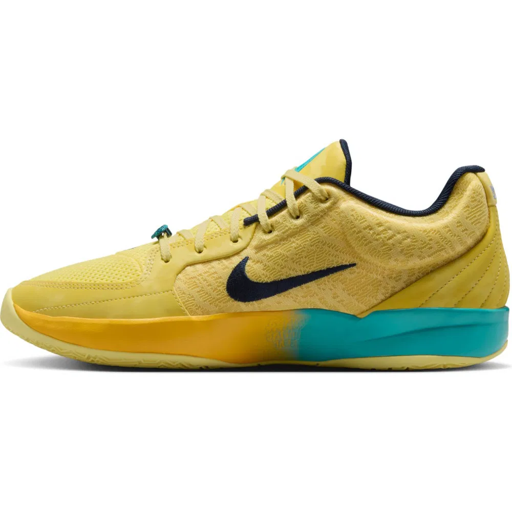 La tige principalement jaune est agrémentée de touches de bleu marine et bleu turquoise, pour composer le “Swoosh” figurant sur l’empeigne ou faire ressortir le logo “Ja” sur la languette. La semelle intermédiaire en bleu turquoise est également complétée par un jaune plus foncé.
