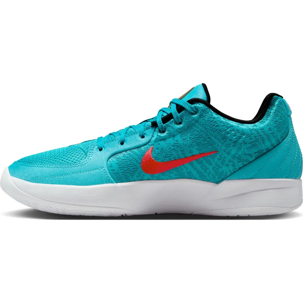 C’est donc tout naturellement que Nike a renouvelé l’opération sur la Ja 2. Le coloris est pratiquement identique, avec une tige turquoise, ici flanquée d’un « Swoosh » en rouge et des mêmes traces de griffes de Grizzly en noir sur l’empeigne. L’ensemble repose sur une semelle blanche. Parmi les finitions, le logo du joueur apparaît en doré sur la languette. On est sur l’un des coloris les plus réussis de cette Ja 2. C’est bon, on peut à présent passer à la Nike Ja 3 !