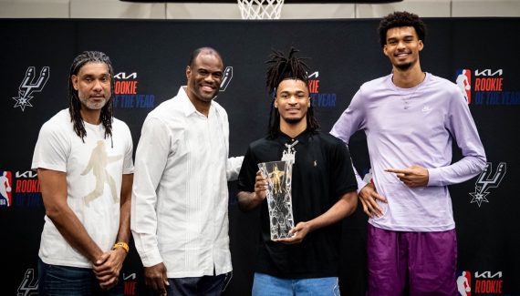 Car avant lui, trois joueurs des Spurs avaient remporté ce trophée de meilleur débutant : David Robinson (1990), Tim Duncan (1998) et Victor Wembanyama (2024). Rien que ça. « En toute humilité, je pense que je n’aurais pas dû faire partie de ce groupe », estime-t-il, alors qu’il a pris une photo avec ce trio et le trophée pour fêter ça.