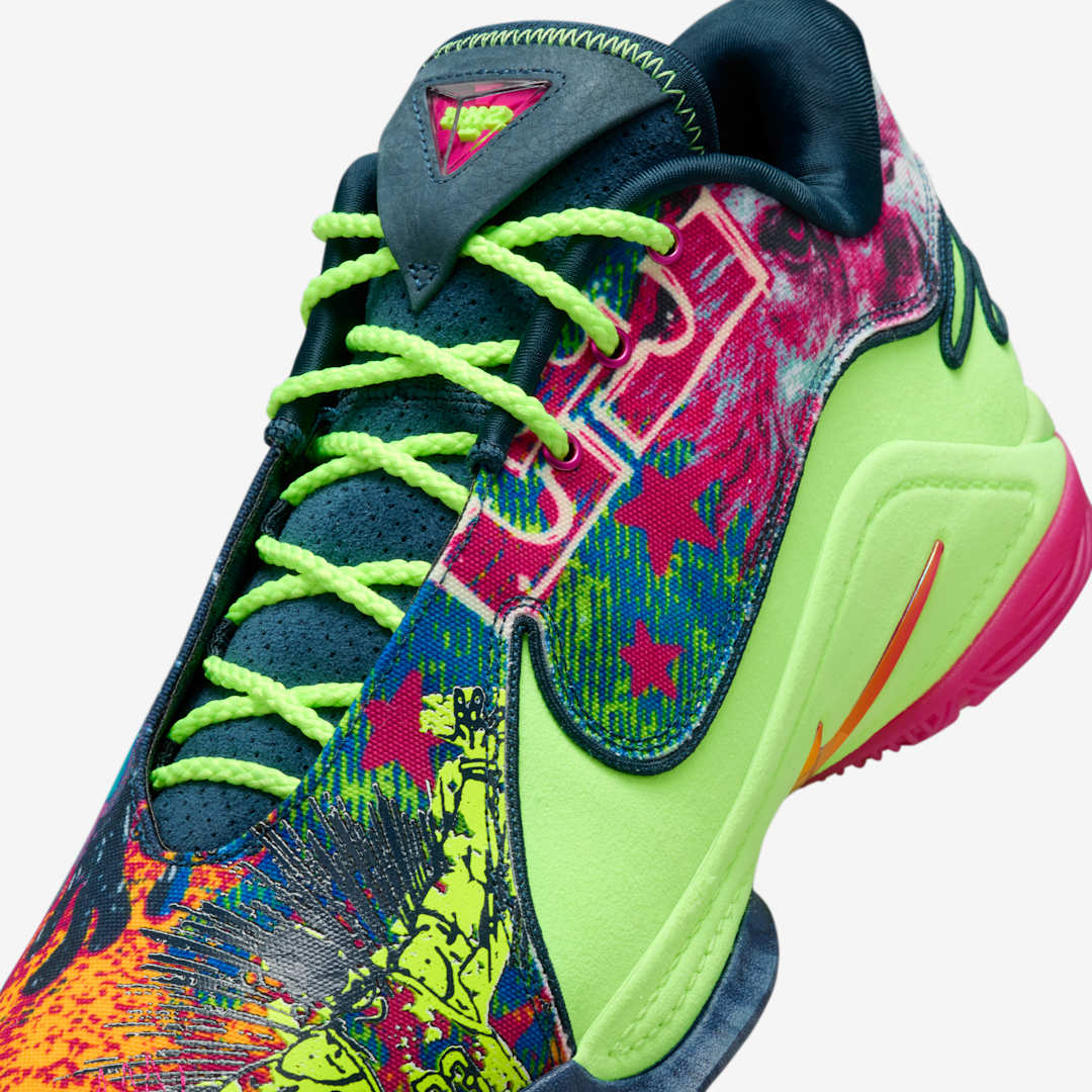 Pour l’instant, le fiston de 17 ans continue de se faire la main au lycée en attendant de rejoindre les Wildcats d’Arizona à la rentrée en NCAA. Le « King » a profité de ce coloris « Bryce’s World » de la LeBron 22 pour le mettre lui aussi à l’honneur. On retrouve un cocktail explosif de couleurs, avec une dominante vert clair sur la tige et vert foncé pour habiller le col et la languette, avec une semelle bleu marine et rose qu’on retrouve aussi sur la tige.