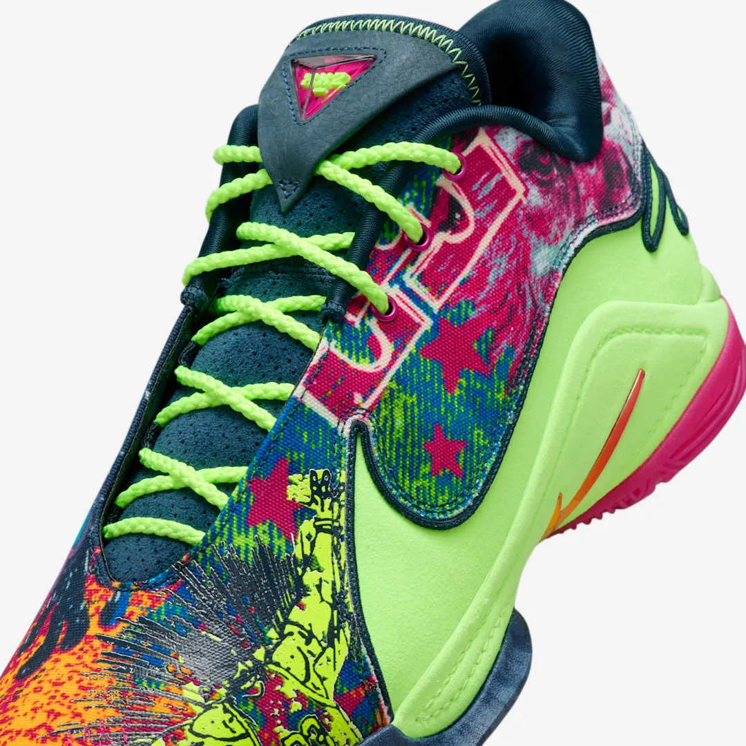 Pour l’instant, le fiston de 17 ans continue de se faire la main au lycée en attendant de rejoindre les Wildcats d’Arizona à la rentrée en NCAA. Le « King » a profité de ce coloris « Bryce’s World » de la LeBron 22 pour le mettre lui aussi à l'honneur. On retrouve un cocktail explosif de couleurs, avec une dominante vert clair sur la tige et vert foncé pour habiller le col et la languette, avec une semelle bleu marine et rose qu’on retrouve aussi sur la tige.