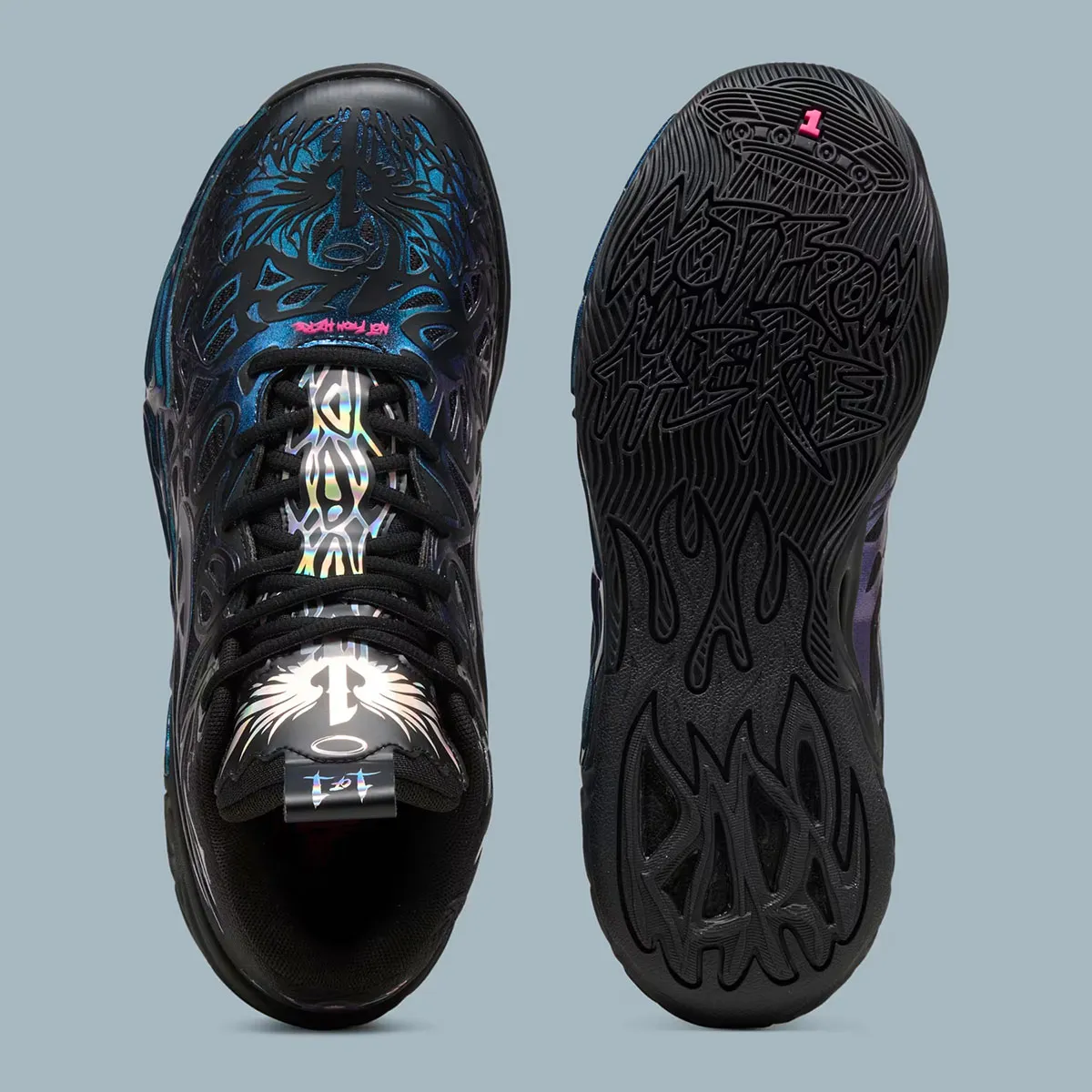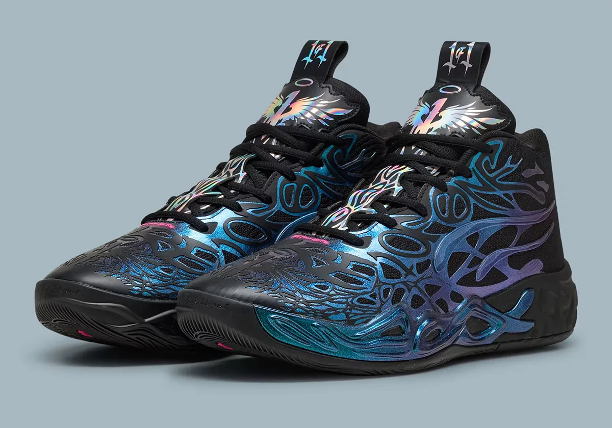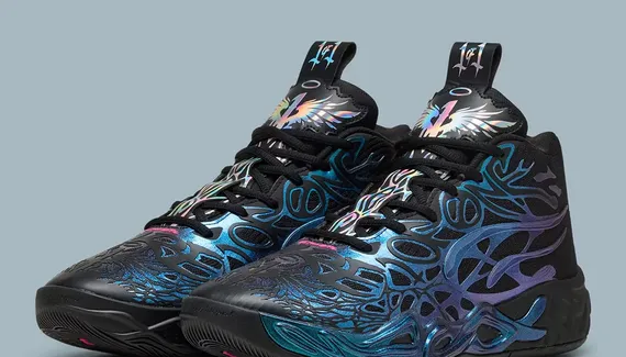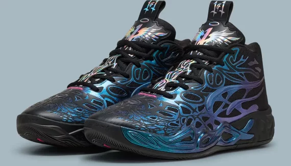 Baptisé « Reflections », il se présente avec une tige ici habillée en noir avec des finitions scintillantes entre bleu et violet, mais le plus inattendu se trouve sur le talon avec le dessin d’un LaMelo Ball en mode danseur, vêtu d’un costume violet tout droit sorti des années 70 et une chemine rose, visiblement prêt à enflammer le dancefloor. Il ne manque plus que la boule à facettes !