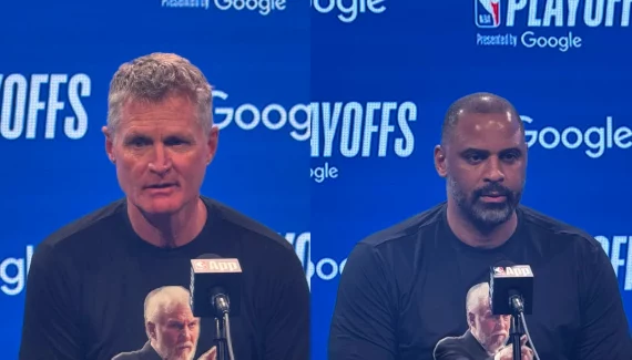 Steve Kerr est arrivé en conférence de presse avec un T-shirt noir à l’effigie de Gregg Popovich, avec l’inscription “Thanks, Pop!” et a profité de l’occasion pour dire un merci appuyé à l’un des ses mentors et ami proche.