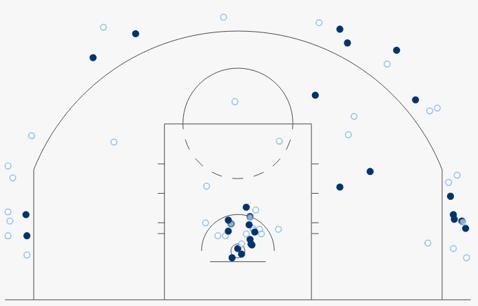 Résultat ? Il termine ce premier tour à 13/31 de loin. Soit 42% de réussite derrière la ligne à 3-points, son meilleur pourcentage de réussite à 7m25 dans une série de playoffs en carrière !