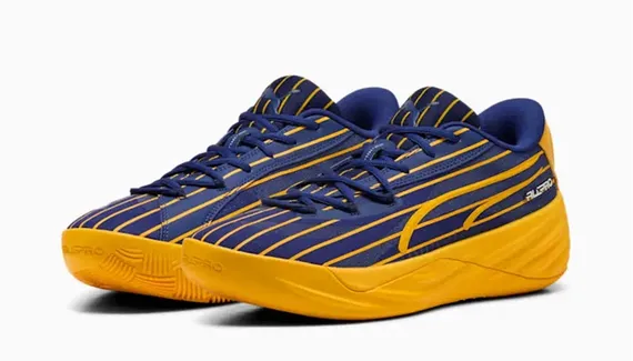Son équipementier entend bien surfer sur cette vague en dégainant le coloris « Pinstripes » de la All-Pro Nitro, le coloris « Player Exclusive » avec lequel le meneur a planté cet incroyable « game winner » à 3-points dans le Game 2 mardi soir. La paire est habillée aux couleurs des Pacers, avec une tige bleu marine assortie de rayures jaune reposant sur une semelle jaune.