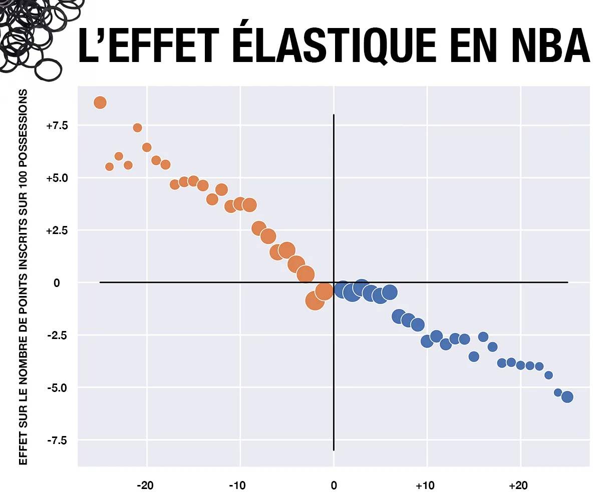 Mais Jeremias Engelmann, ancien spécialiste des stats avancées chez les Suns et les Mavericks, rappelle un autre phénomène en jeu : “l'effet élastique”. En gros, l'élastique représente l'écart entre deux équipes et plus il augmente, plus l'élastique se tend, et plus la force qui peut rapprocher les deux formations augmente.