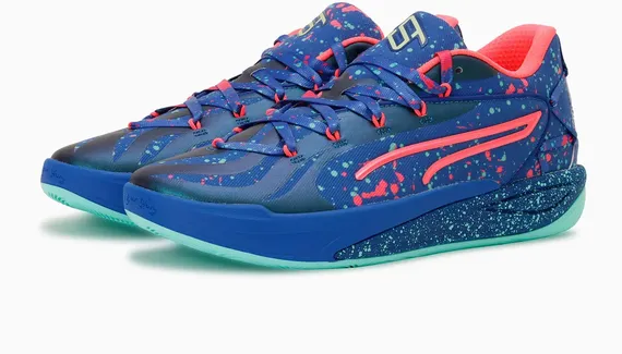 Sortie il y a un peu plus d'un mois, la Stewie 4 va ainsi bénéficier d'un nouveau coloris « Night Vision » pour l'occasion. La tige en bleu nuit est tachetée de rouge pâle et bleu ciel. On retrouve des taches en bleu turquoise sur la semelle bleu nuit, avec un revêtement extérieur également bleu turquoise. Le logo de la joueuse sur la languette et l'inscription « Stewie » sur le talon avec le logo Puma dénotent en vert pâle.