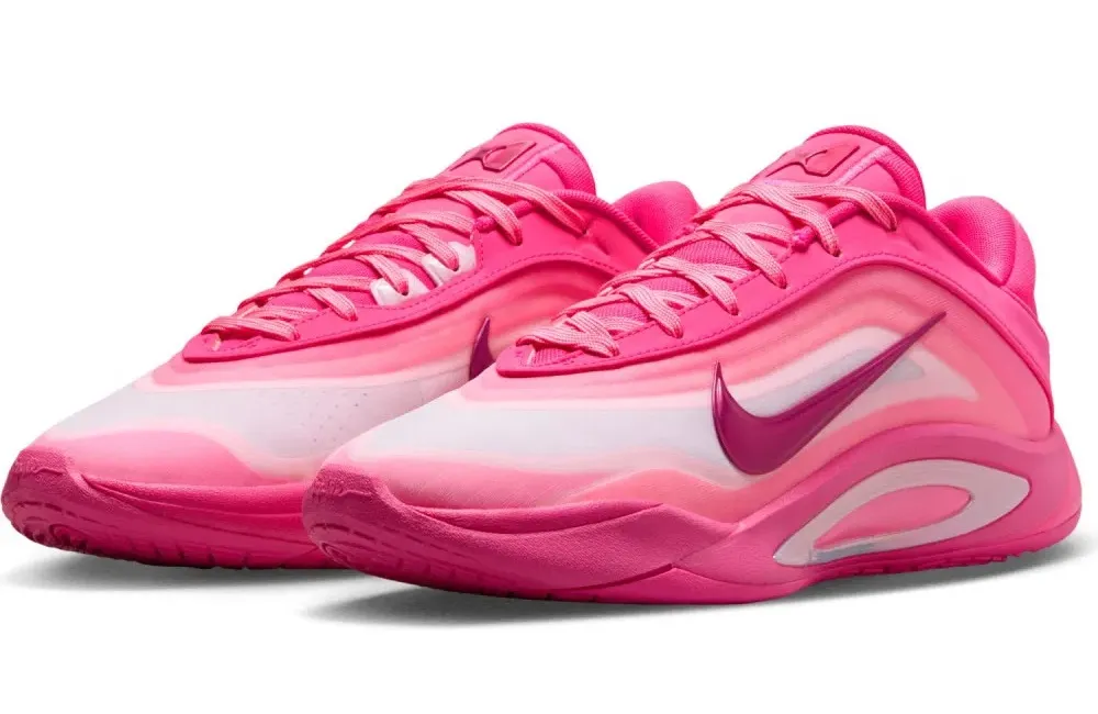 Le premier coloris choisi sera ce « Pink A’ura », avec une tige en mesh respirant travaillée sur un dégradé de rose-rouge allant jusqu’à du blanc nacré et un signe Nike bien allongé sur l’empeigne, en violet. On note plusieurs détails faisant référence à sa famille, comme les symboles situés sur la partie intérieure de la languette, destinés à ses parents. Son logo est visible sur la languette et sous la semelle.