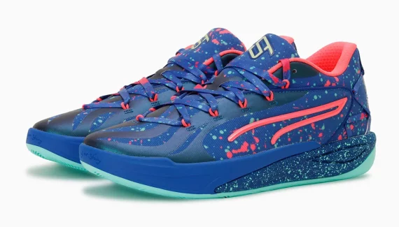 Sortie il y a un peu plus d’un mois, la Stewie 4 va ainsi bénéficier d’un nouveau coloris « Night Vision » pour l’occasion. La tige en bleu nuit est tachetée de rouge pâle et bleu ciel. On retrouve des taches en bleu turquoise sur la semelle bleu nuit, avec un revêtement extérieur également bleu turquoise. Le logo de la joueuse sur la languette et l’inscription « Stewie » sur le talon avec le logo Puma dénotent en vert pâle.