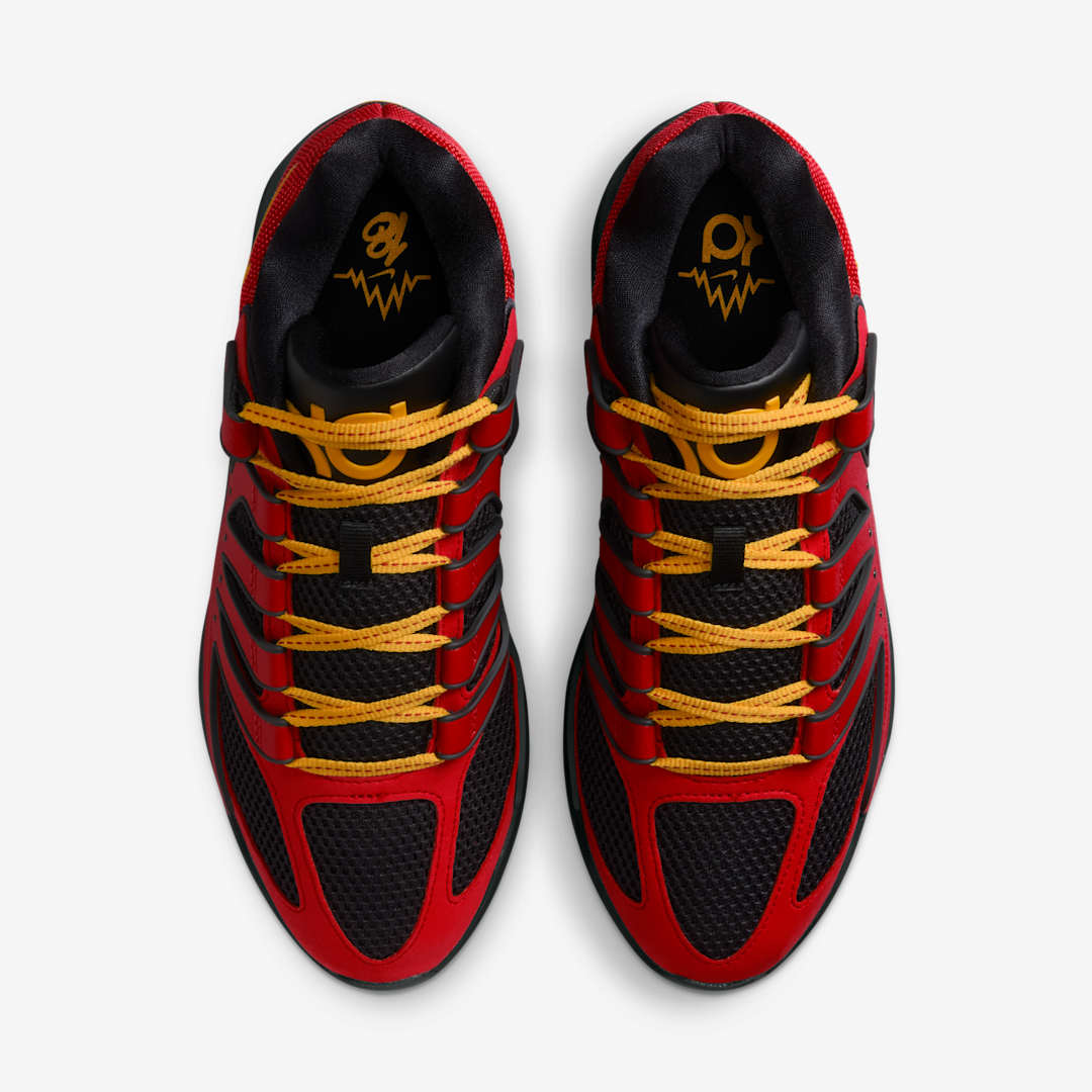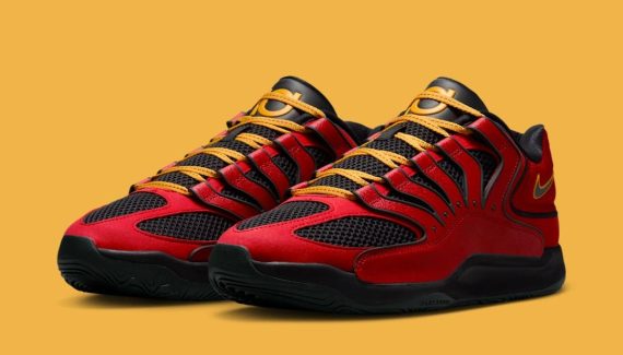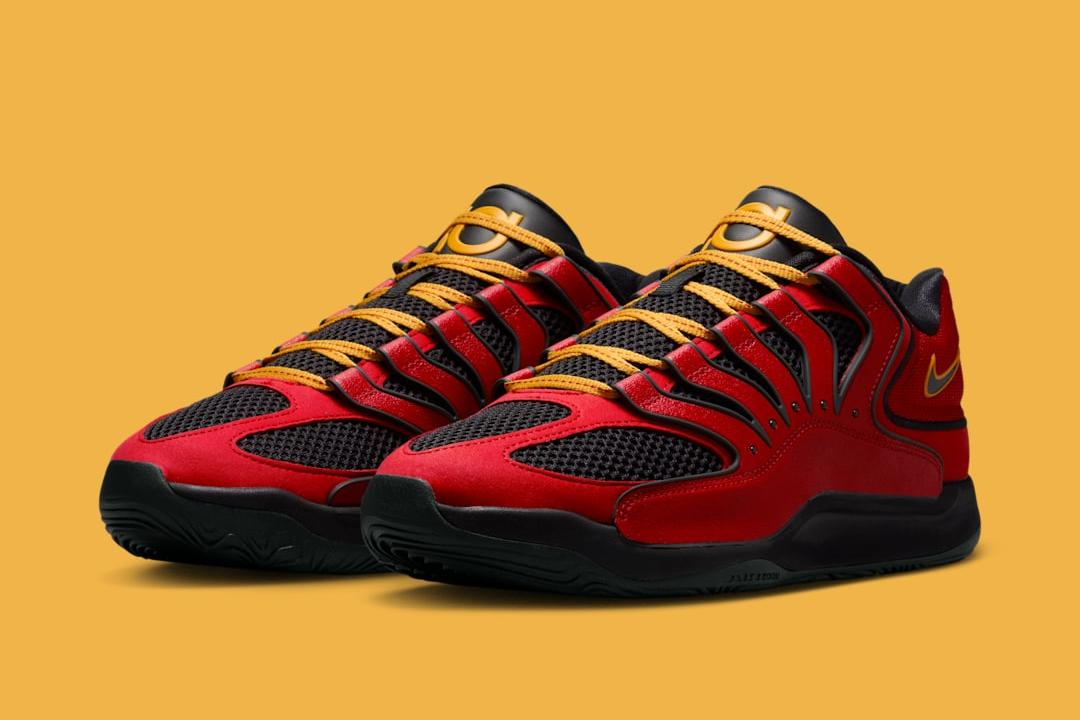 Il s’agit d’un hommage à la Nike Air Bakin et son coloris emblématique qu’on retrouve ici, entre rouge-orange, jaune et noir pour habiller la tige. Le logo du joueur sur la languette, la pastille « Easy » sur le talon, les lacets et les contours du « Swoosh » ressortent ainsi en jaune. C’est également l’un des premiers coloris de la KD 18 porté par Kevin Durant cette saison, dès la fin février, à l’occasion d’un match face aux Pelicans.
