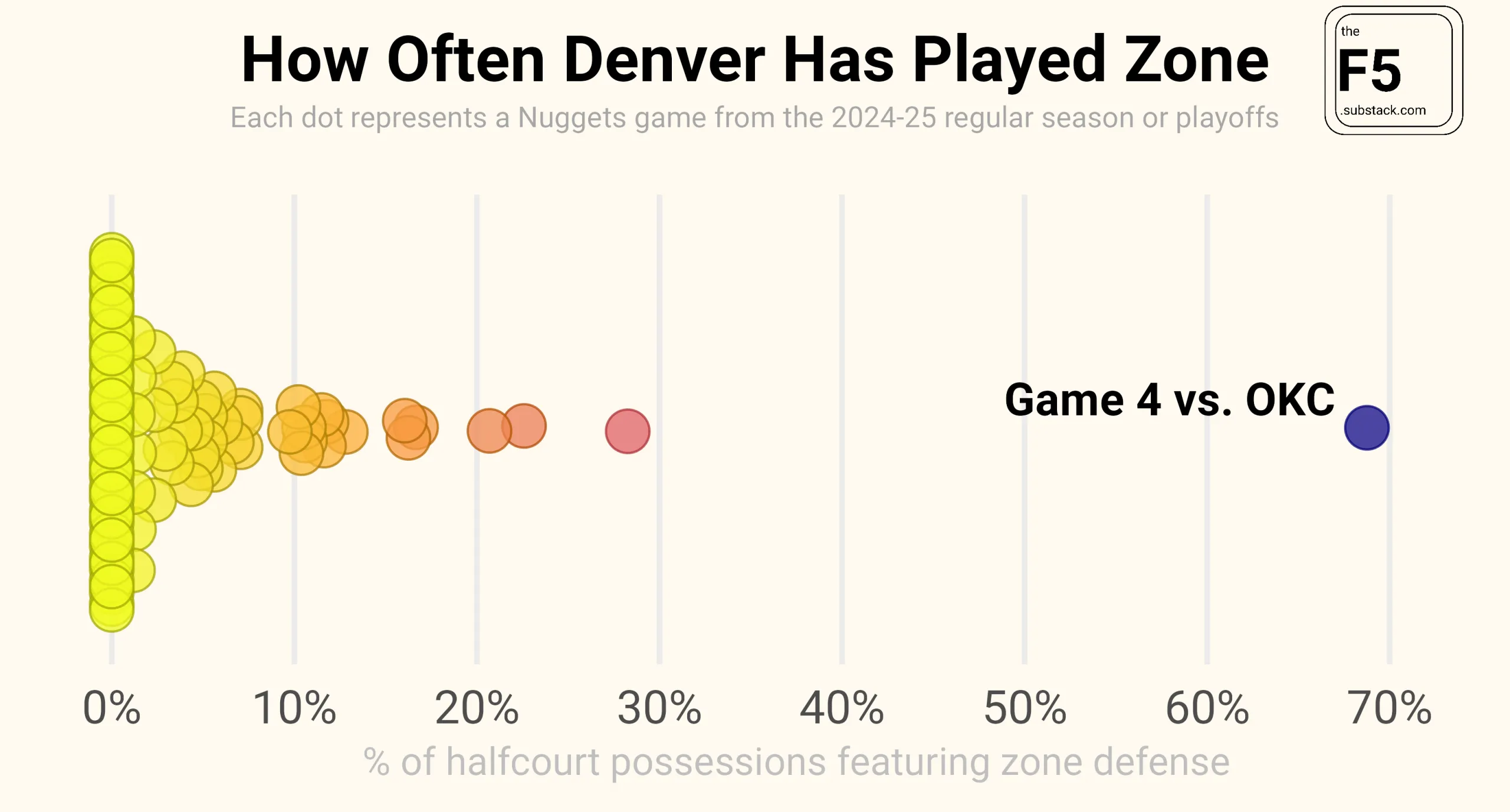 Au total, les Nuggets avaient utilisé la zone sur près de 70% de leurs possessions défensives lors de ce match, alors qu'ils n'avaient pourtant jamais dépassé la barre des 30% cette saison !