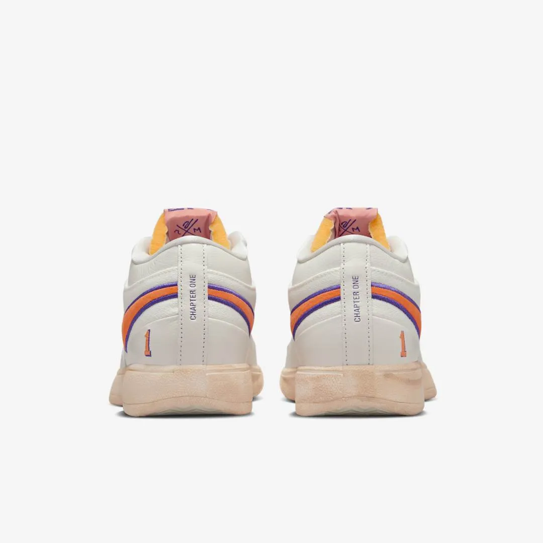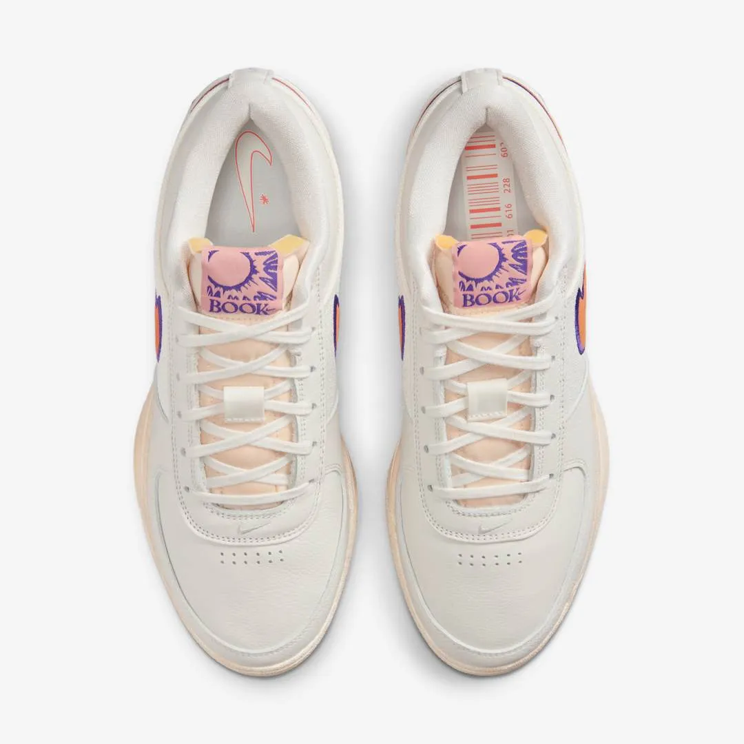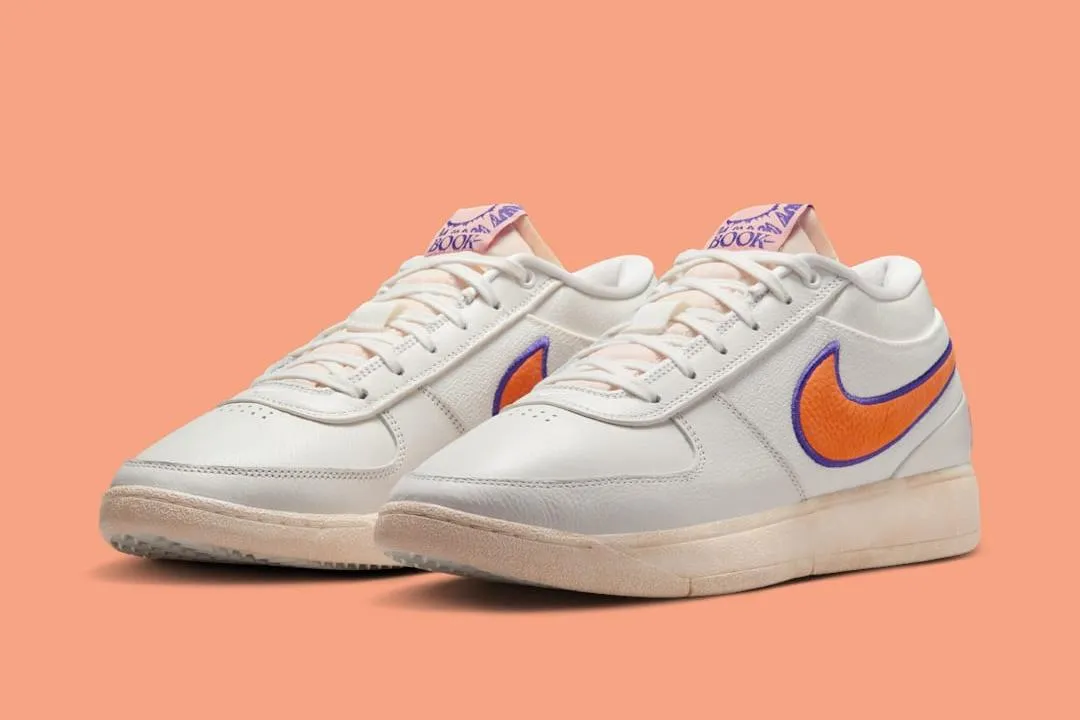 Baptisé « The Valley », il se présente avec une tige blanche classique ornée de finitions aux couleurs des Suns, avec notamment un « Swoosh » orange aux contours en violet, Le motif présent sur la languette, illustrant un soleil et l’inscription « Book » apparaît également en violet, tout comme l’inscription « Chapter One » sur le talon. Le numéro 1 de Devin Booker ressort également en orange.