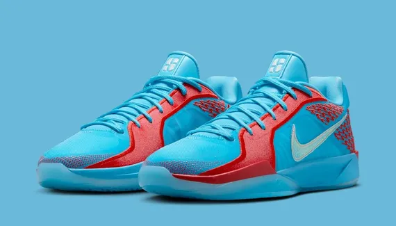 On la retrouve ici avec une tige en bleu ciel traversée par une bande rouge et un « Swoosh » blanc sur l’empeigne. Le logo « S » de Sabrina Ionescu apparaît également en blanc sur la languette. L’ensemble donne ce coloris «Slurpee», inspiré de la marque de granita américaine qui est également la boisson rafraichissante préférée de Sabrina Ionescu.