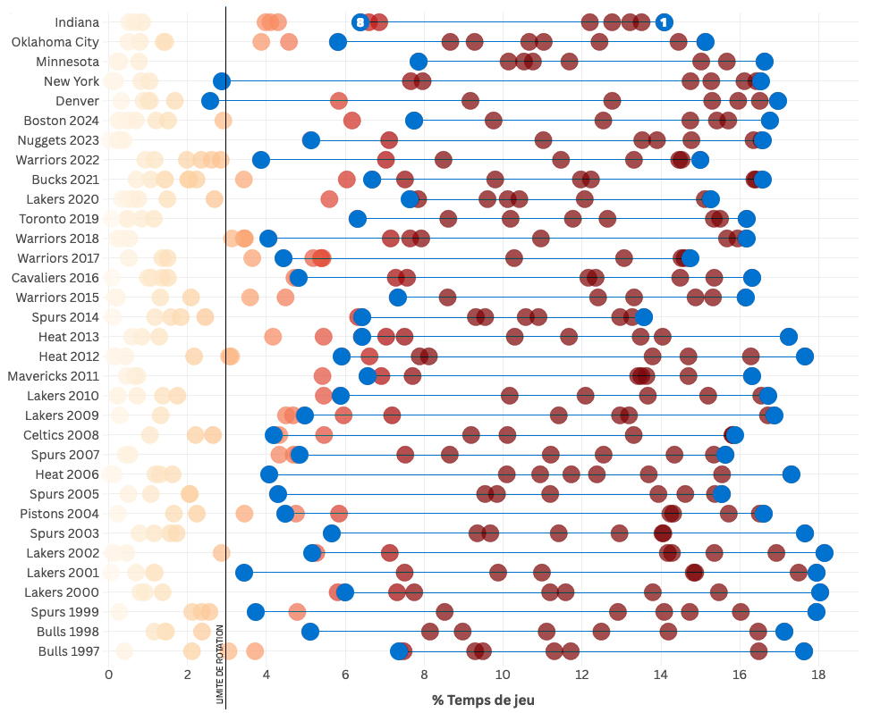 L’élargissement des rotations en playoffs semble en effet un vrai phénomène en NBA. Les Pacers jouent ainsi à 11 depuis le début de la “postseason” et le Thunder à 10, tout comme les Cavaliers le faisaient d’ailleurs…