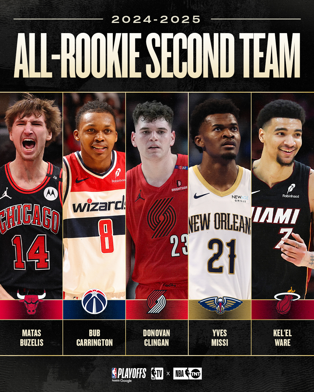Un Kel’el Ware qui doit donc se contenter de la « All-Rookie Second Team », en compagnie de Matas Buzelis (97 points), Yves Missi (90 points), Donovan Clingan (73 points) et Bub Carrington (53 points). Ce qui laisse par exemple Isaiah Collier aux portes du deuxième meilleur cinq, avec ses 52 points…
