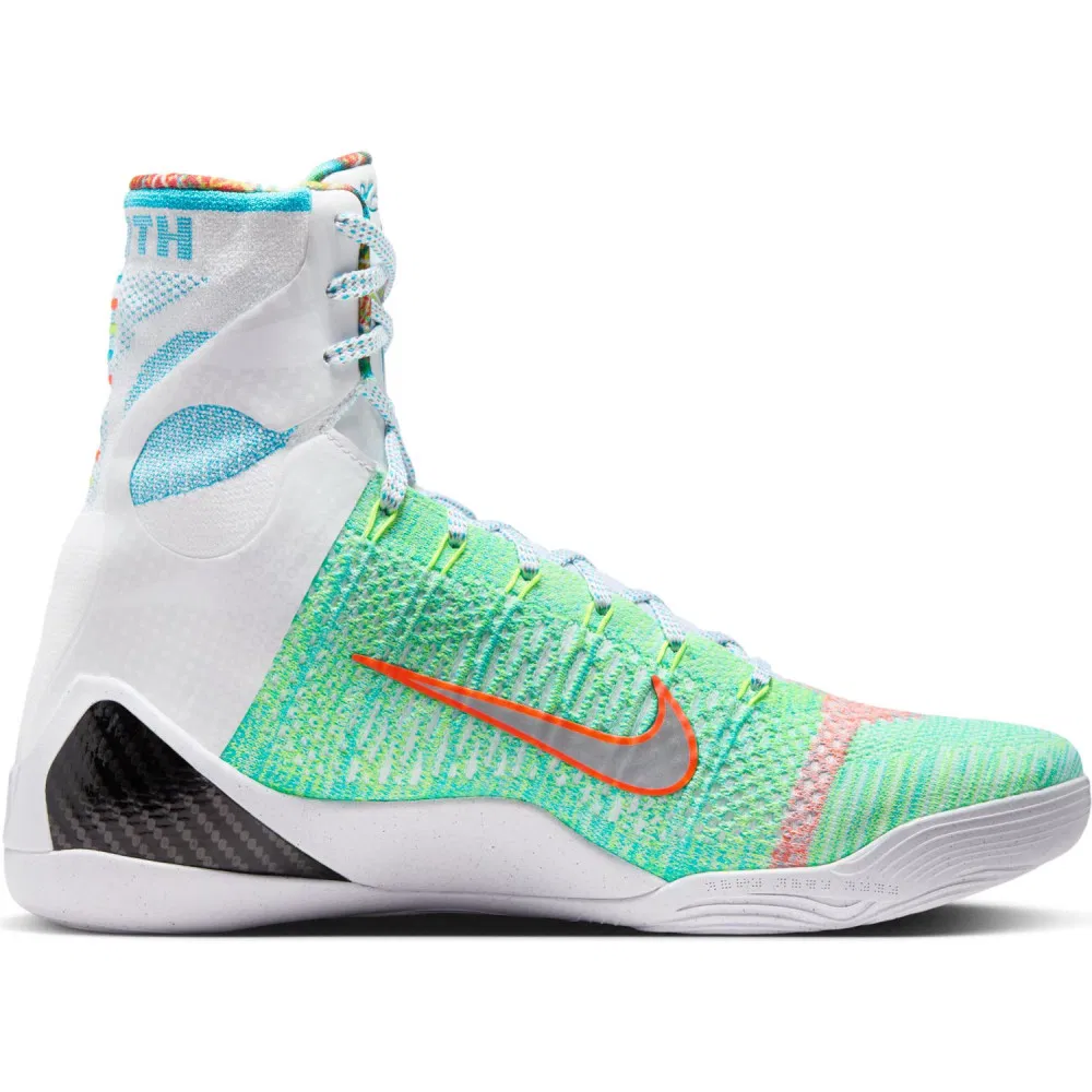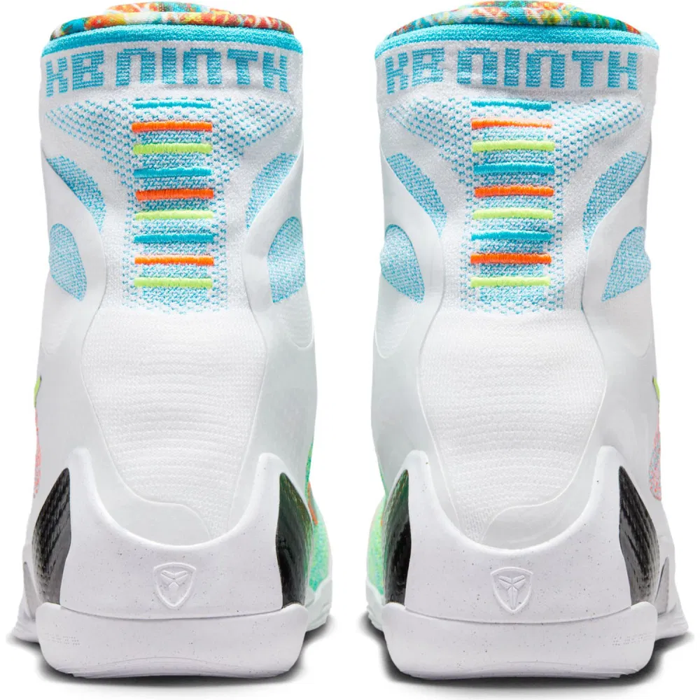 La tige montante en Flyknit, signature de la Kobe 9 Elite, offre ainsi un maintien optimal. Le design asymétrique présente une combinaison de couleurs vives, avec des touches de vert, d’orange, de bleu et de blanc. Le col haut, inspiré des bottes de boxe, assure une stabilité renforcée, tandis que la semelle intermédiaire en mousse « Nike React » vient apporter sa dose de confort.