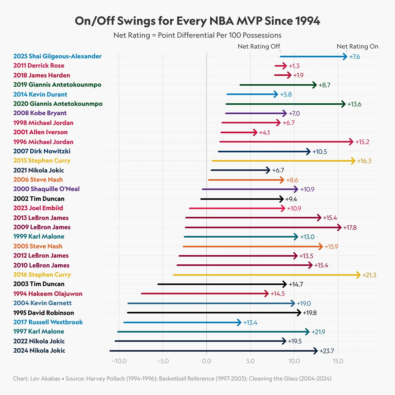 Car Shai Gilgeous-Alexander est, depuis 1994, le MVP dont l'équipe est la plus forte… quand il n'est pas sur le terrain. Sans lui, Oklahoma City présente ainsi un “Net Rating” (soit la différence entre le nombre de points inscrits et encaissés sur 100 possessions) de +8.4, qui monte à +16.0 quand il est sur le terrain.