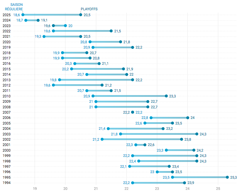 “Il ne fait aucun doute que les playoffs sont plus intenses et je pense que nous voyons l’intensité et l’impact physique comme des synonymes, alors qu’il y a une nuance entre les deux. Il est certain que l’intensité peut créer de l’impact physique, et je ne le nierais pas, mais je pense que c’est surtout l’intensité des playoffs qui est très différente de celle de la saison régulière” conclut-il, alors qu’avec la hausse de l’utilisation du 3-points, le nombre de fautes sifflées en saison régulière est à son plus bas historique… mais que ça remonte justement en playoffs.