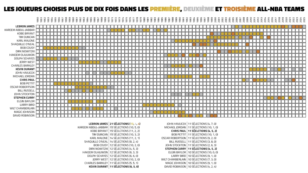 Parmi les joueurs en activité, seuls Chris Paul, Stephen Curry et Kevin Durant ont également dépassé le seuil des 10 sélections dans les All-NBA Teams.