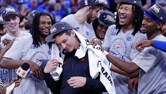 « Ils sont idiots ! », sourit Mark Daigneault tandis que Shai Gilgeous-Alexander et Chet Holmgren réajustent sa casquette après que d’autres lui ont couvert le dos de serviettes. Localement, la pratique a un nom : se faire « gallowed » – un terme repris en conférence de presse – en référence à Nick Gallo, le journaliste d’OKC gentiment chahuté à chaque interview d’après-match du Thunder.