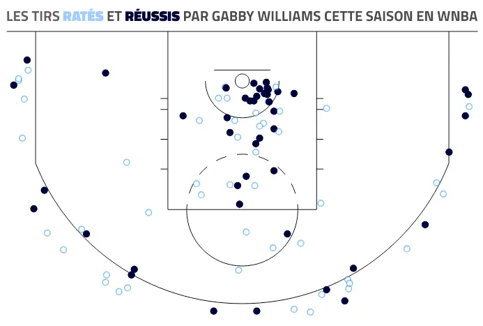 Une petite surprise au classement des meilleures shooteuses de WNBA cette saison. À la 10e place, on trouve Gabby Williams avec 43.6% de réussite après huit rencontres disputées. Surprise, car depuis ses débuts dans le championnat féminin en 2018, elle ne tourne qu’à 28% dans l’exercice.