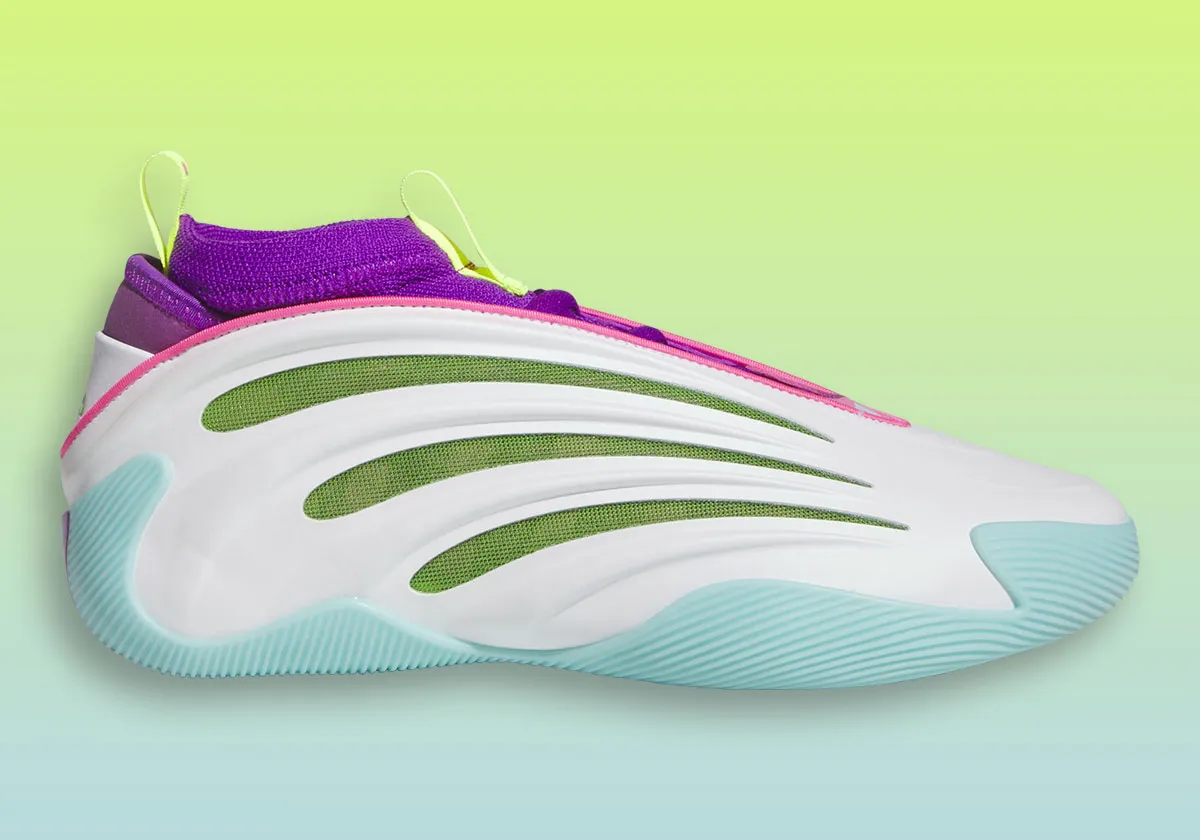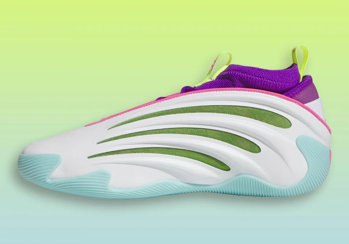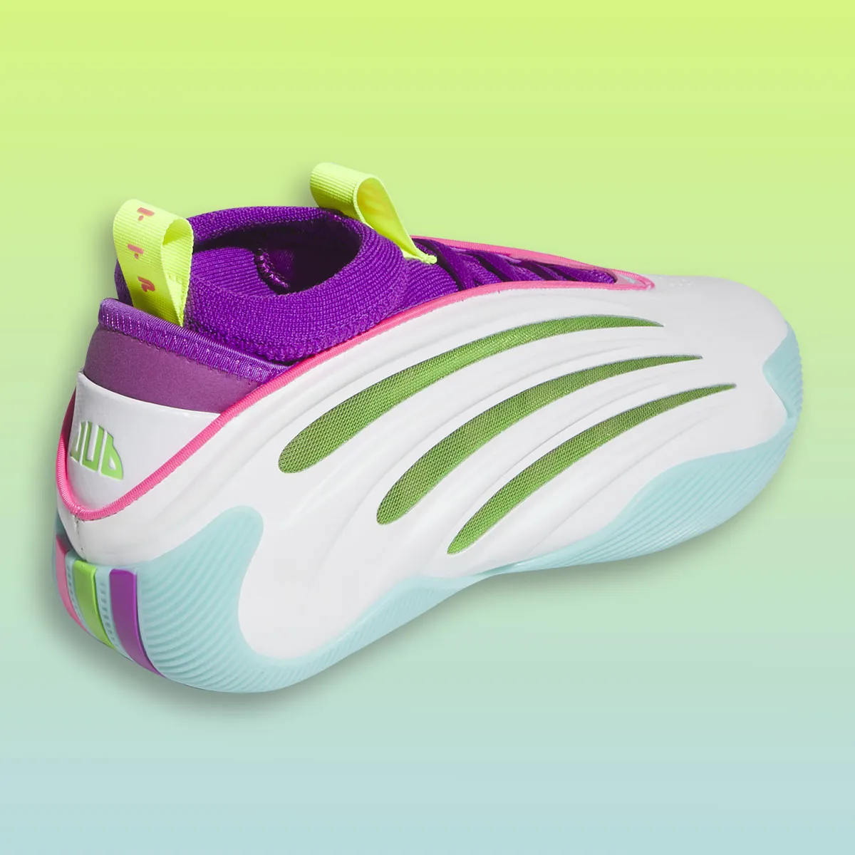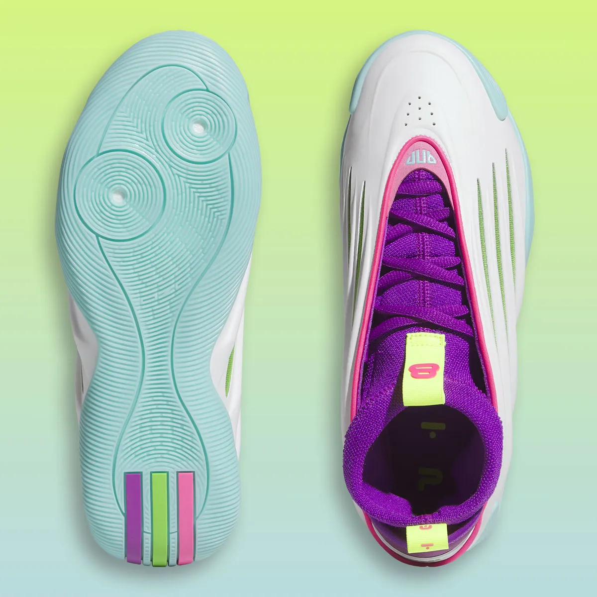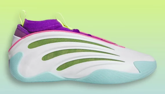 Pour le clin d’œil à Jalen Williams, il faut regarder la languette en vert fluo sur laquelle figure son numéro 8. Un « Dub » est également en vert fluo écrit sur le talon. Les trois bandes d’adidas ressortent quant à elles en violet, vert et rose sous le talon.