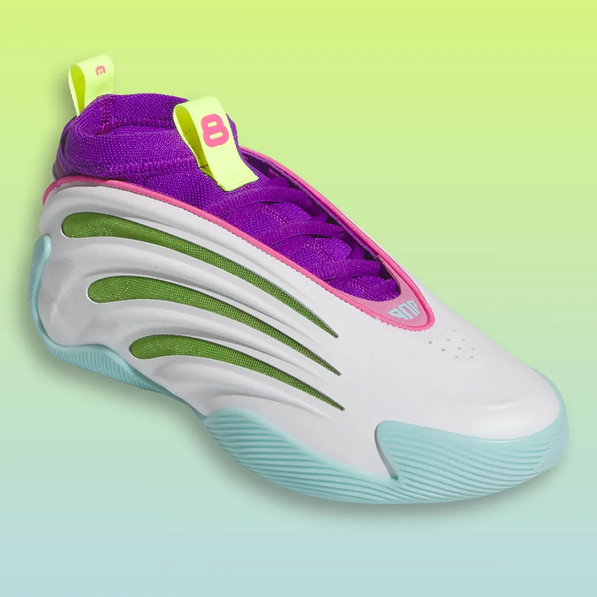 Pour le clin d’œil à Jalen Williams, il faut regarder la languette en vert fluo sur laquelle figure son numéro 8. Un « Dub » est également en vert fluo écrit sur le talon. Les trois bandes d'adidas ressortent quant à elles en violet, vert et rose sous le talon.